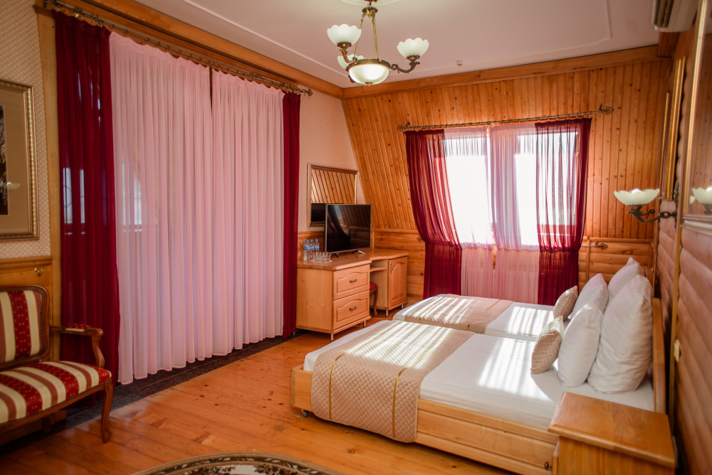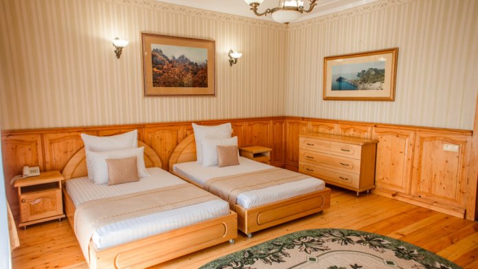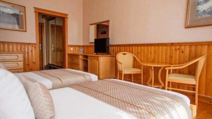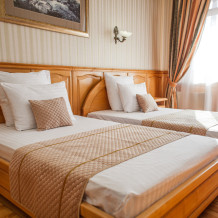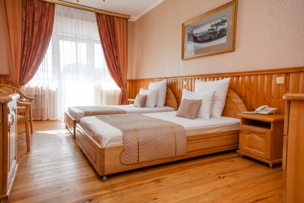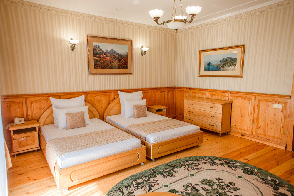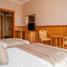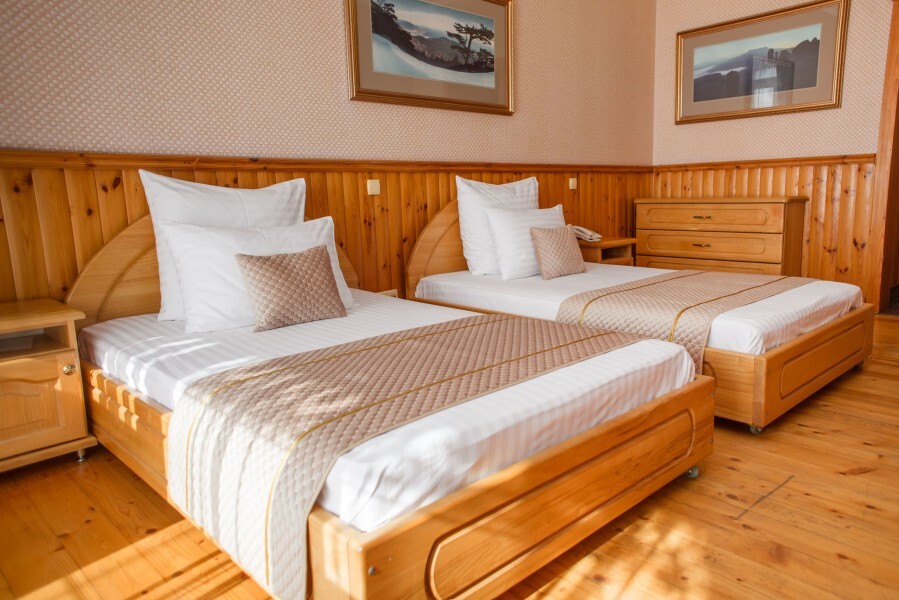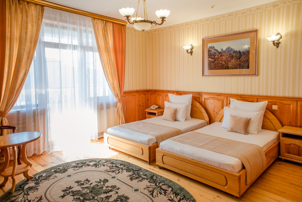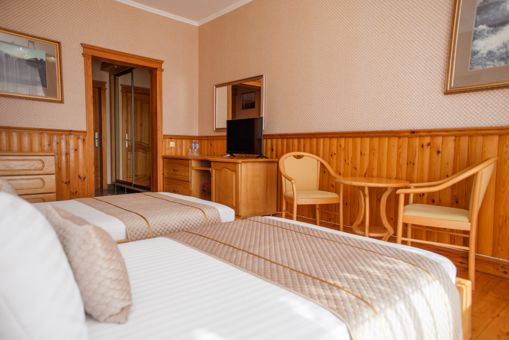 Двухместный номер улучшенной планировки с двумя раздельными кроватями и видом на горы. Идеально подходит для двухместного размещения. В каждом номере имеется балкон с мебелью, санузел с ванной, вместительный шкаф-купе с зеркальными дверями, кондиционер, мини-бар, сейф, фен, кабельное телевидение, телефон.