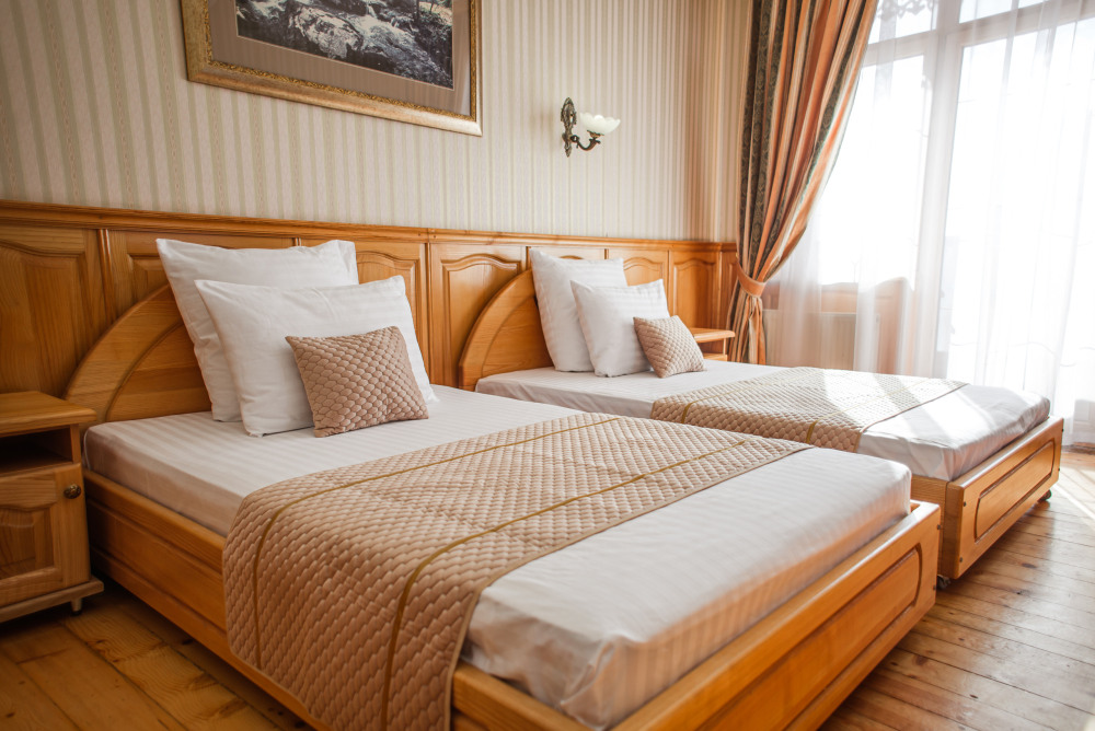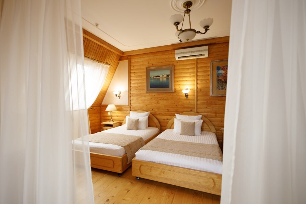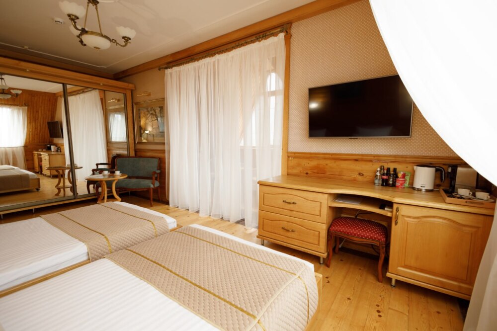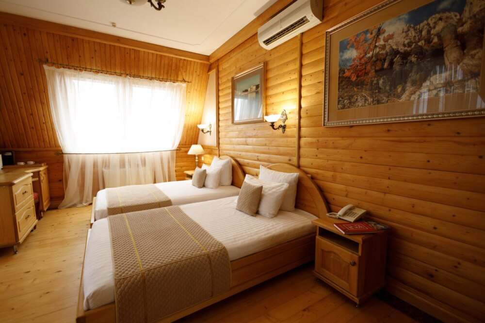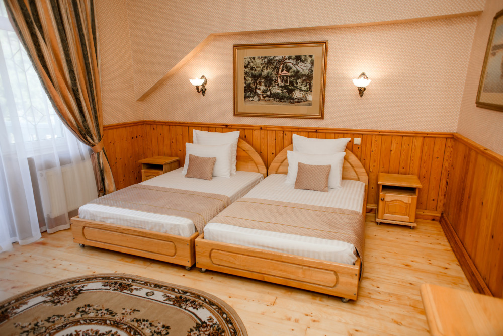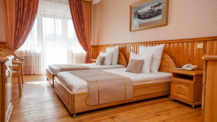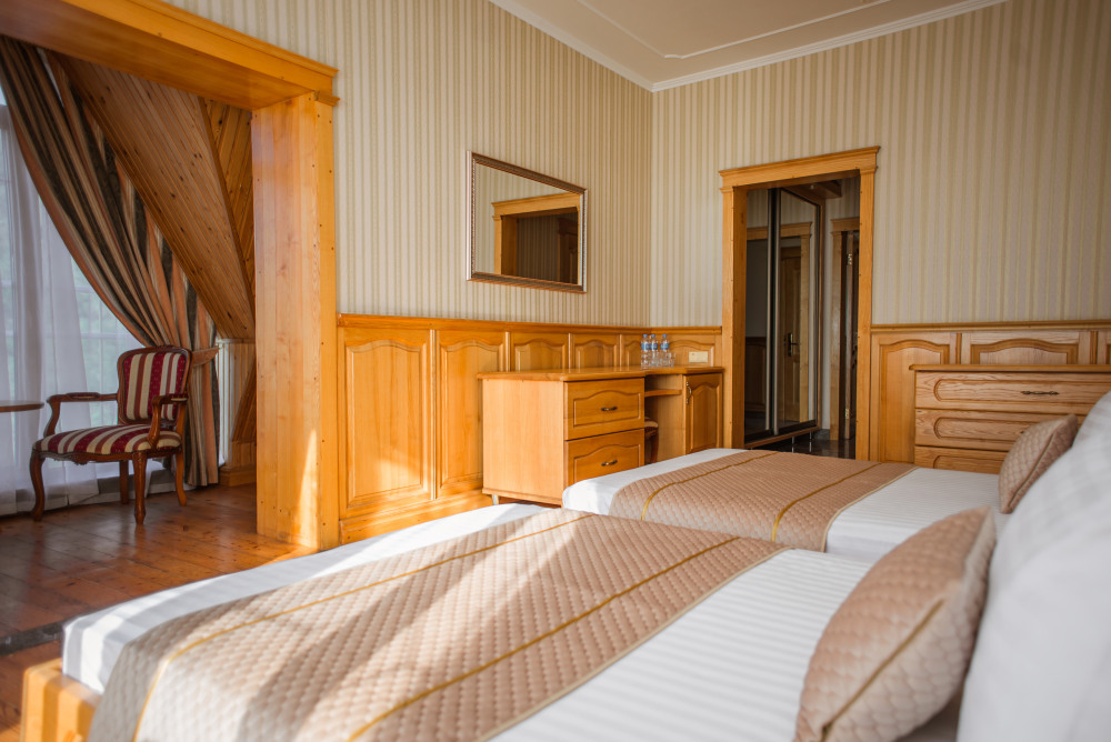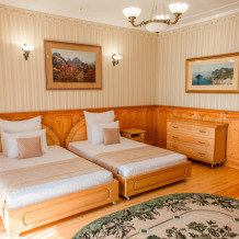 Двухместный номер улучшенной планировки с двумя раздельными кроватями и видом на горы. Идеально подходит для двухместного размещения. В каждом номере имеется балкон с мебелью, санузел с ванной, вместительный шкаф-купе с зеркальными дверями, кондиционер, мини-бар, сейф, фен, кабельное телевидение, телефон.