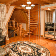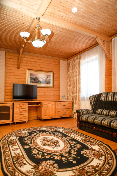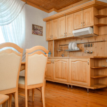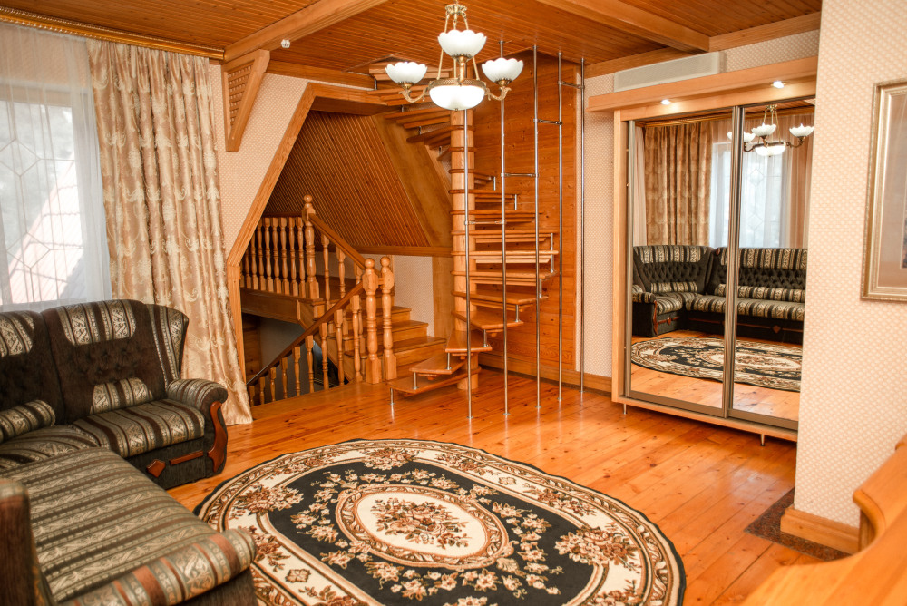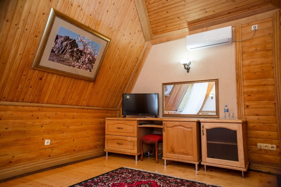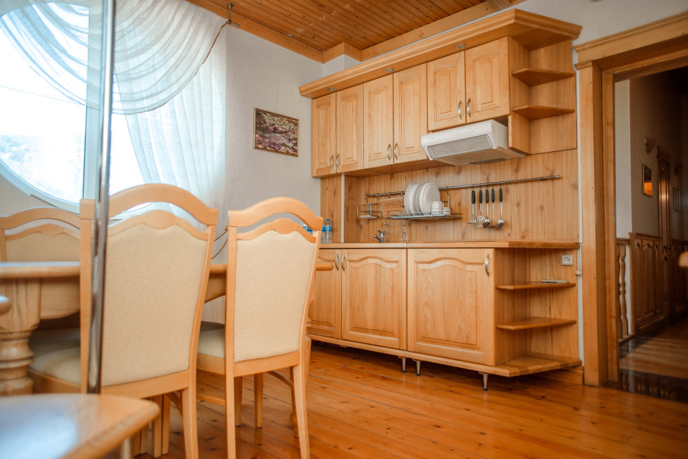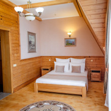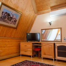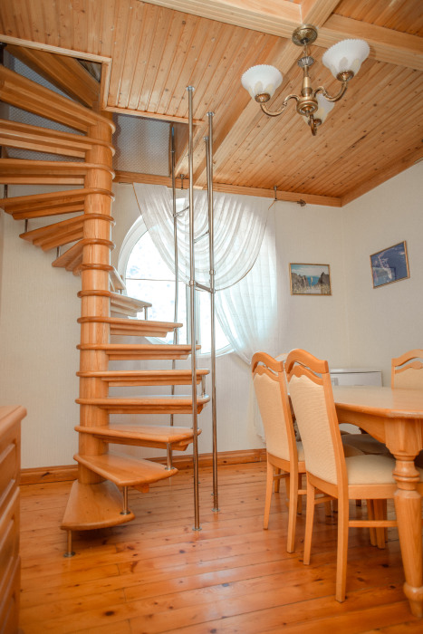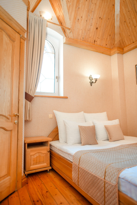 На первом этаже – уютная кухня с полным оснащением, необходимым для приготовления пищи, и спальня с двухспальной кроватью, из кухни на второй этаж поднимается винтовая лестница, которая ведет в еще одну спальню с двухспальной кроватью. Санузел с ванной. Отдельный туалет на 2 этаже. На второй этаж ведет деревянная лестница. В номерах установлены кондиционеры на обоих этажах. Особенностью именно этого номера, а он единственный такого рода в нашем гостином дворе - наличие кухни и двух спален.