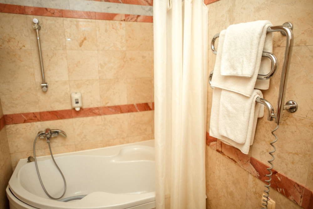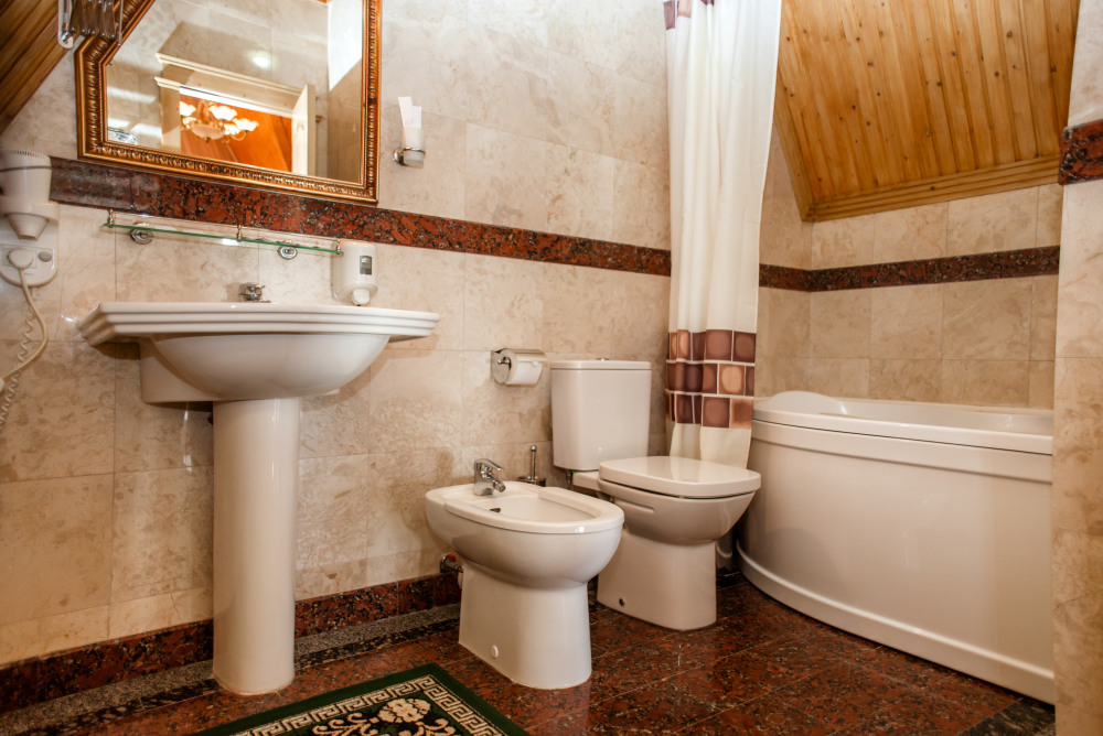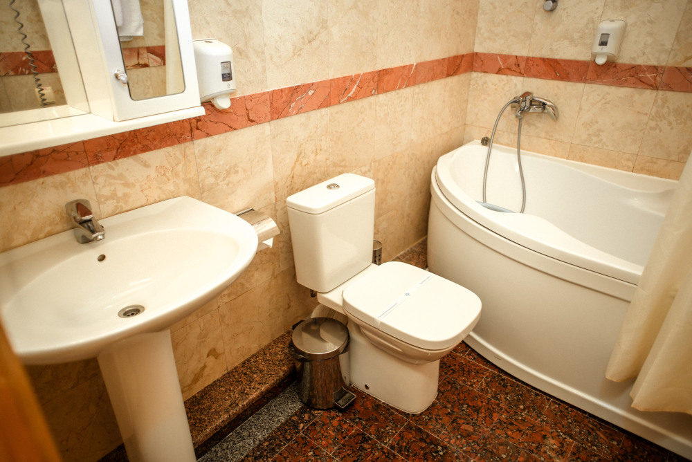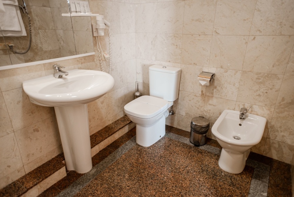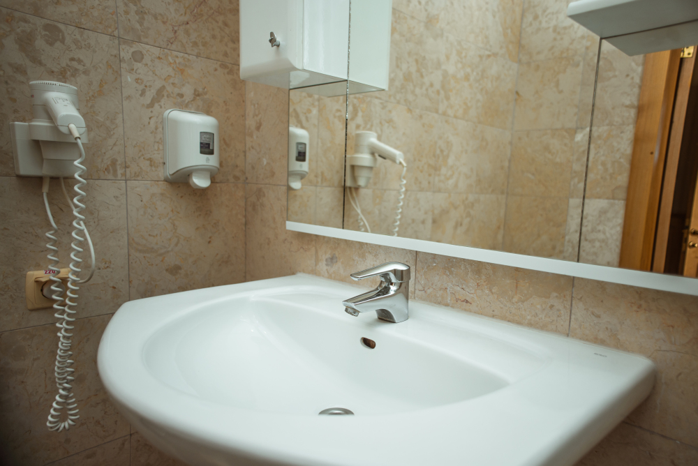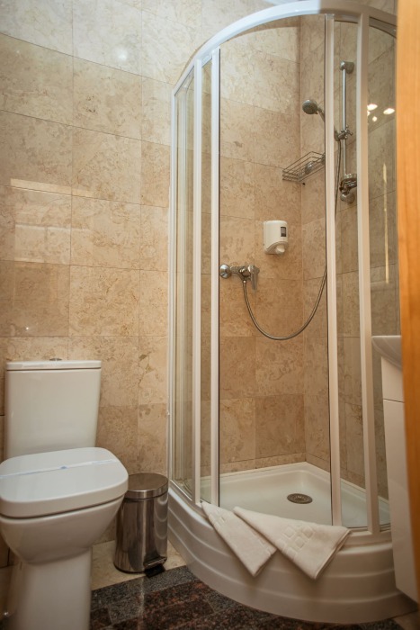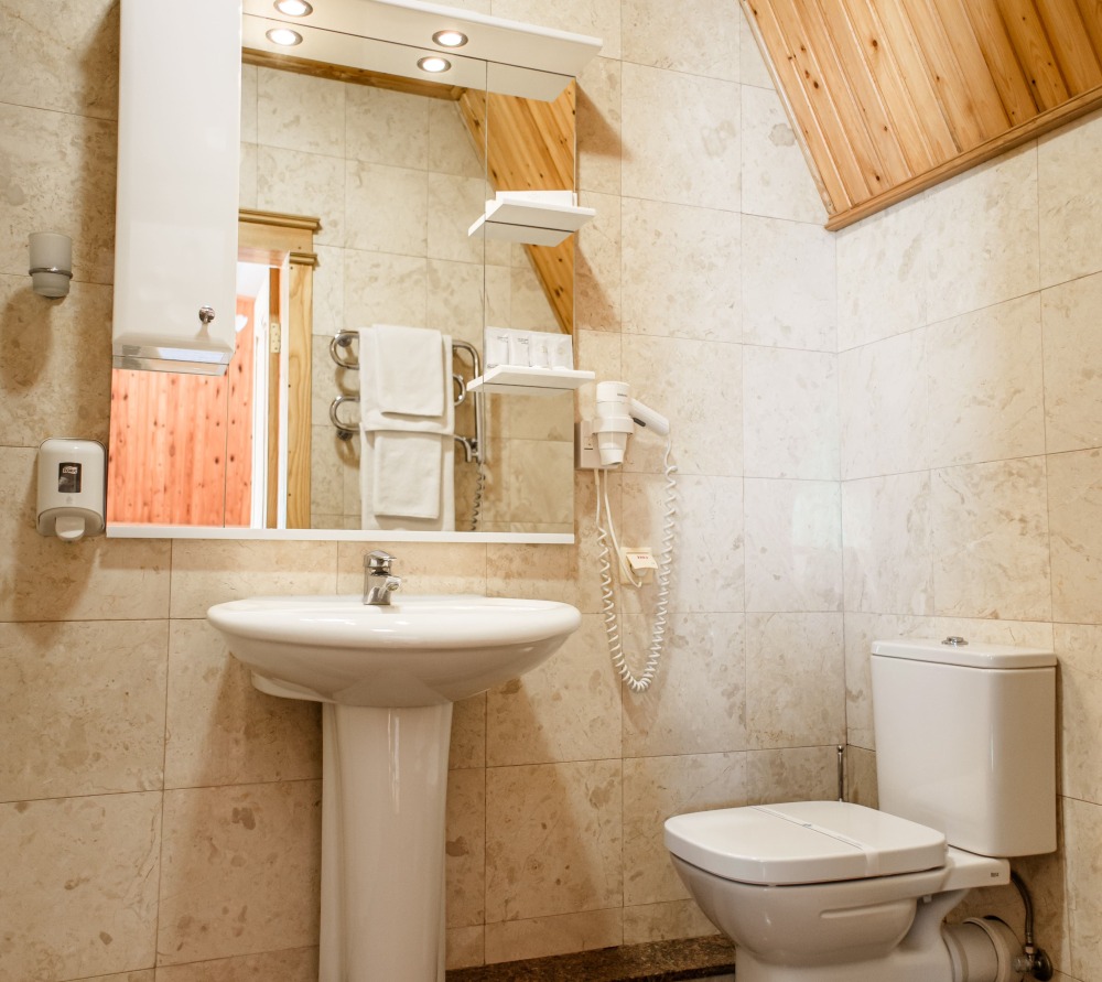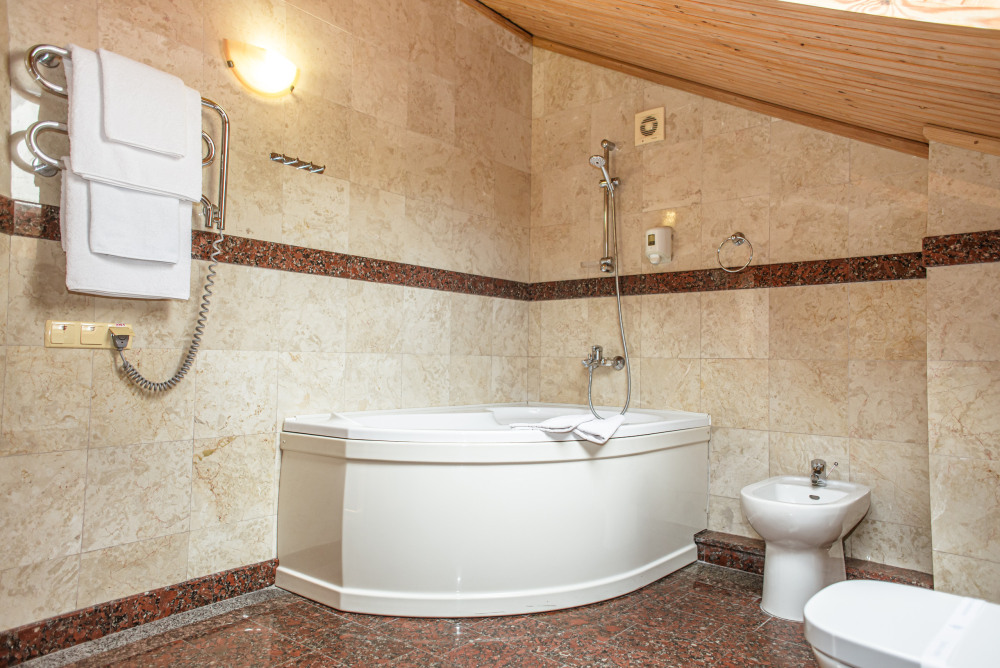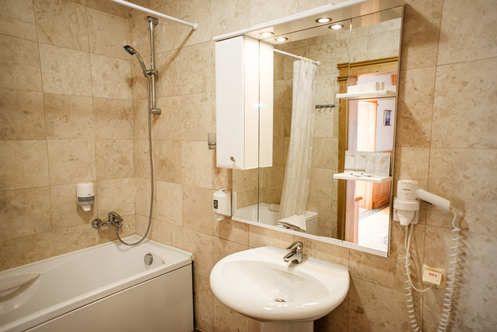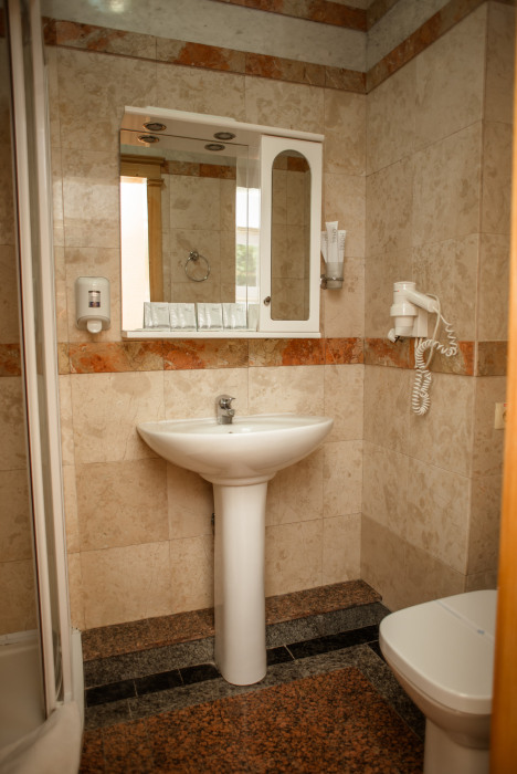 В номере имеется санузел с душевой кабиной, вместительный шкаф-купе с зеркальными дверями, кондиционер, мини-бар, сейф, фен, кабельное телевидение, телефон.
