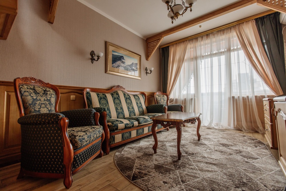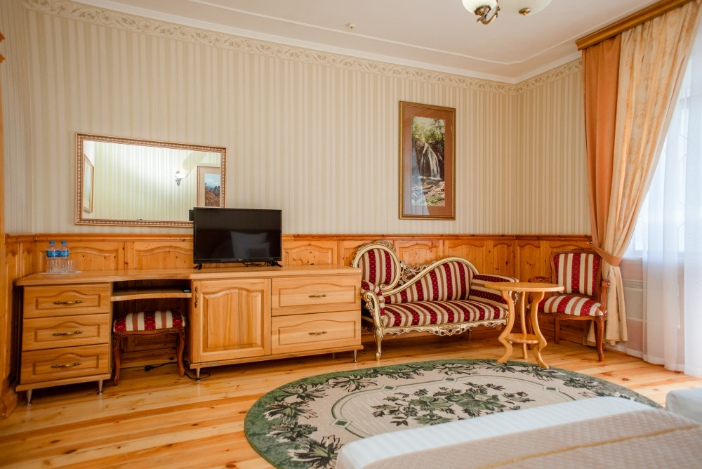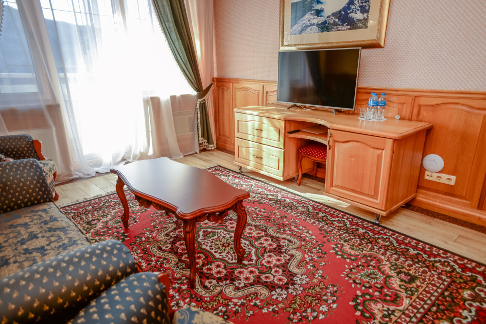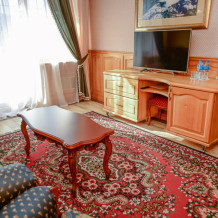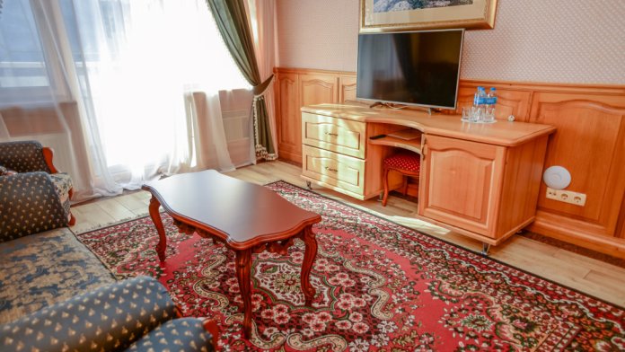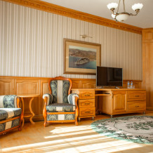 Двухкомнатный уютный номер улучшенной планировки с видом на море. Комнаты разделены арочным входом. В первой комнате расположена полуторная кровать, журнальный столик, стулья. Вторая комната оборудована двумя полуторными кроватями, письменным столом, комодом и телевизором. Идеально подходит для семейного отдыха с детьми. В номере имеется балкон с мебелью, санузел с душевой кабиной, вместительный шкаф-купе с зеркальными дверями, кондиционер, мини-бар, сейф, фен, кабельное телевидение, телефон.