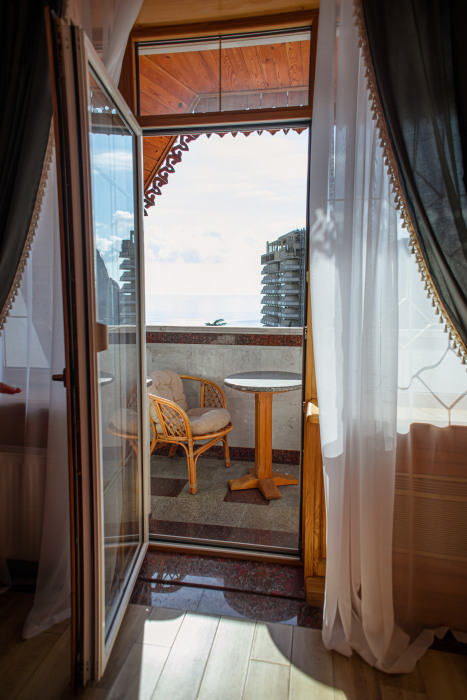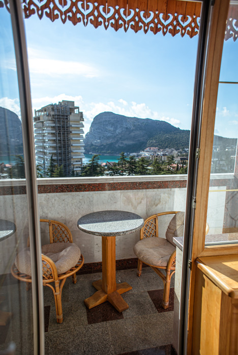 2-комнатный номер улучшенной планировки с видом на море. Между комнатами - арочный вход. Номера рассчитаны на разное количество гостей - от 2 до 4. Номера оснащены соответствующим количеством спальных мест и имеют 2 смежные комнаты для комфортного размещения семьи из 2-4 человек.
