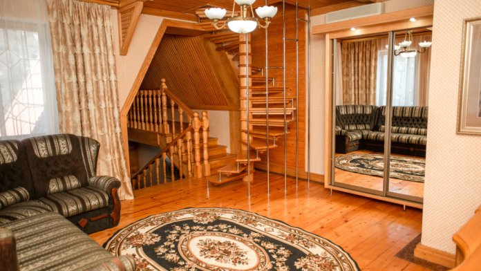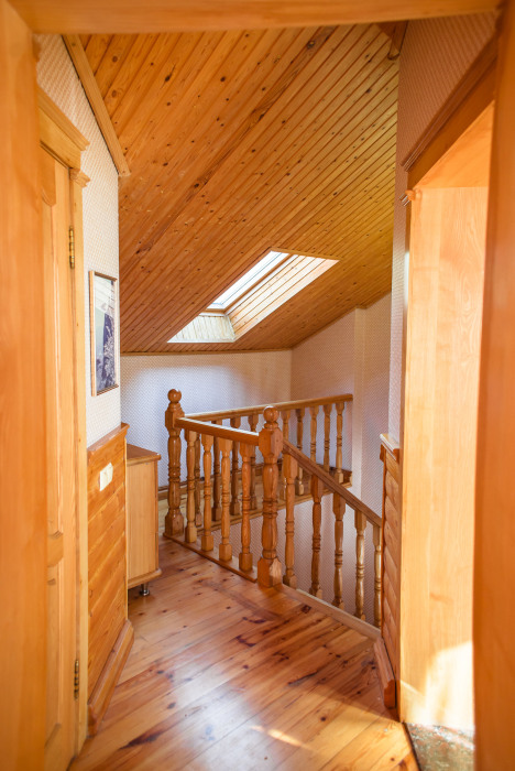 На первом этаже – просторная гостиная с мебелью в классическом стиле и камином, гостевой санузел.