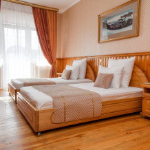 Двухкомнатный уютный номер улучшенной планировки с видом на море. Комнаты разделены арочным входом. В первой комнате расположены две полуторные кровати, журнальный столик, софа, комод, телевизор с плоским экраном. Вторая комната оборудована двумя односпальными кроватями, комодом. Идеально подходит для семейного отдыха с детьми. В номере имеется санузел с душевой кабиной, вместительный шкаф-купе с зеркальными дверями, кондиционер, мини-бар, сейф, фен, кабельное телевидение, телефон.
