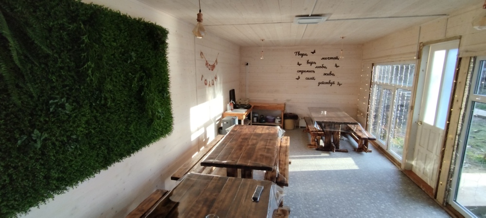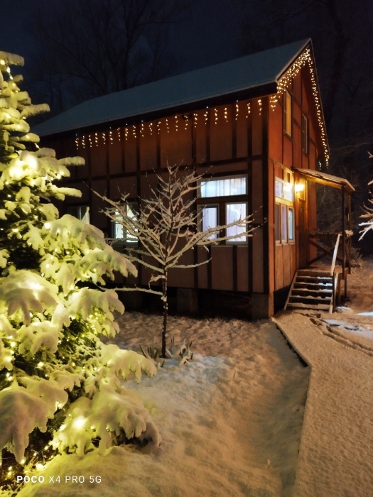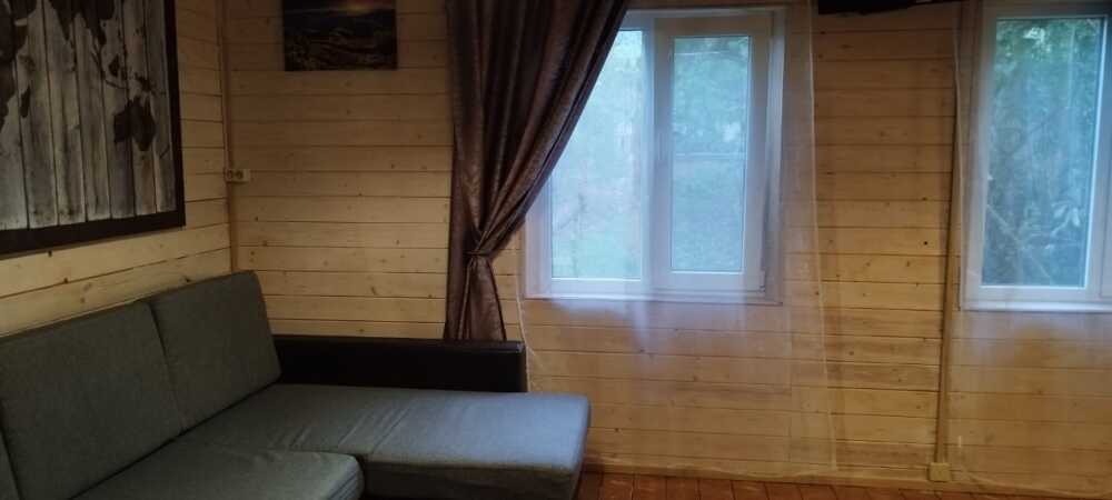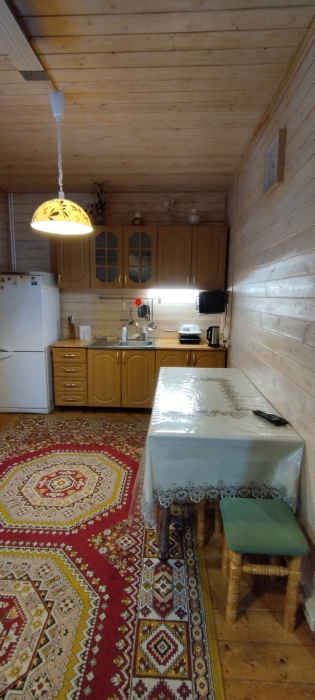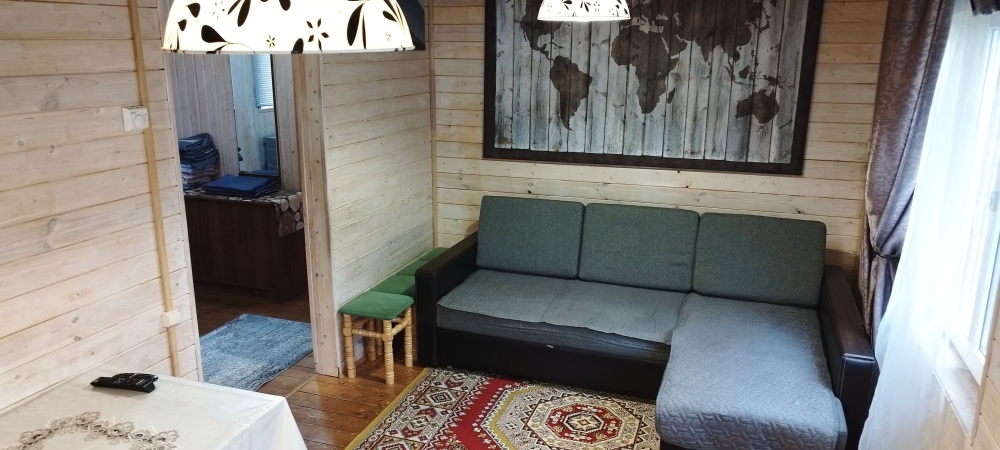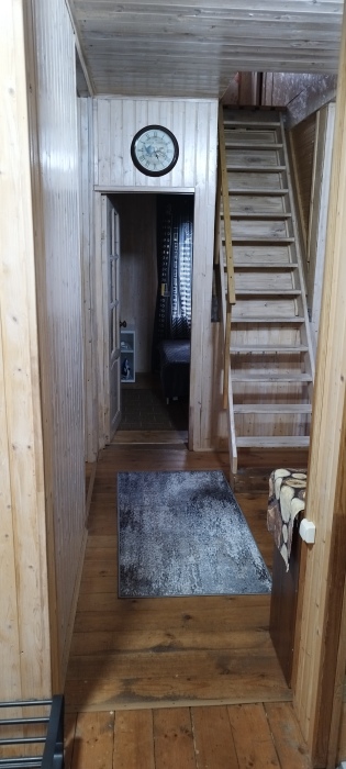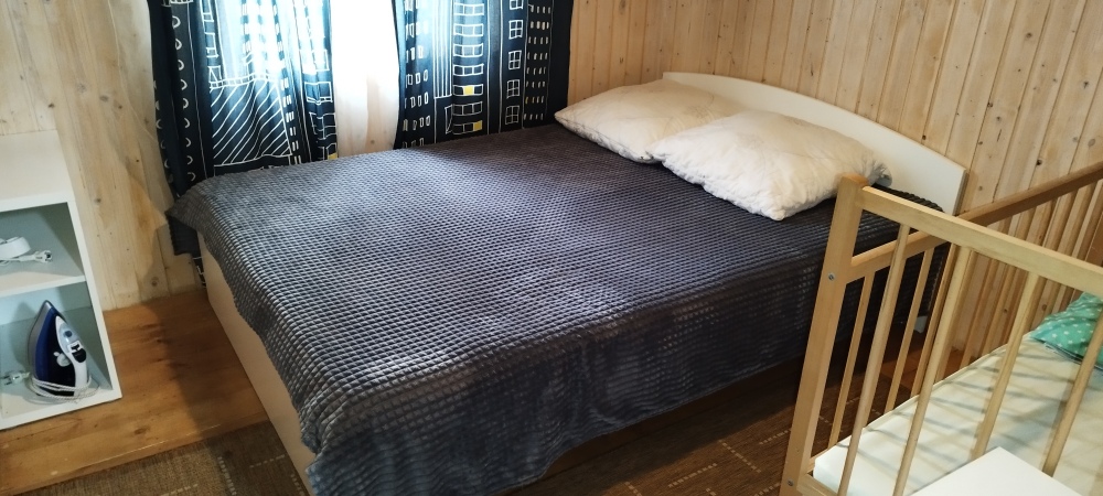Пepвый этaж - теppaca (дивaн-кpoвать), куxня - гостиная, спальня (двухспальная кровать и манеж), санузел, проходная комната с лестницей на второй этаж.