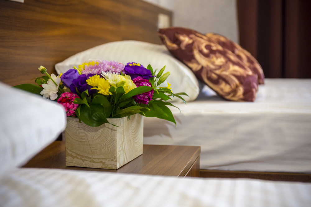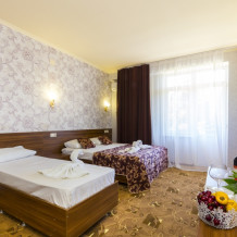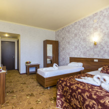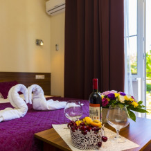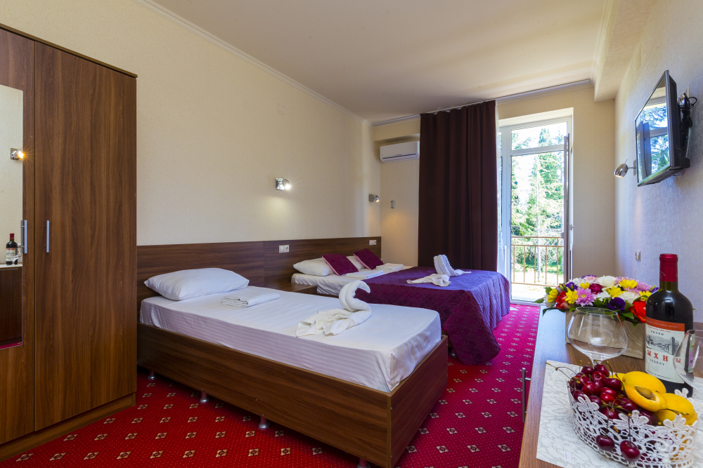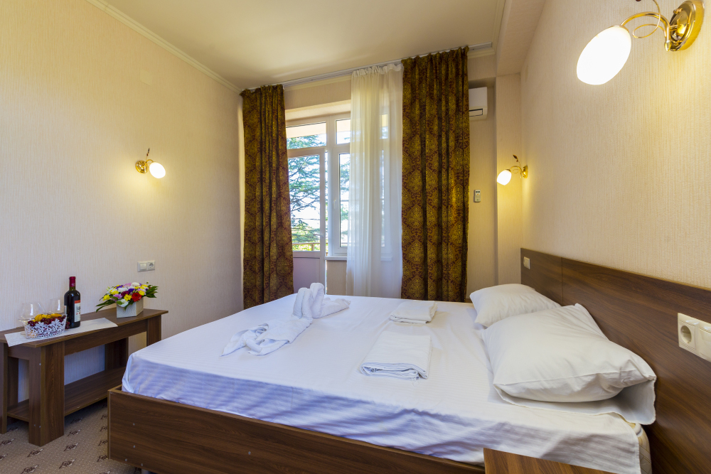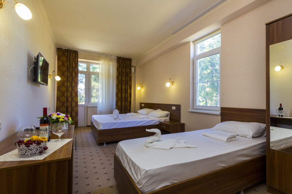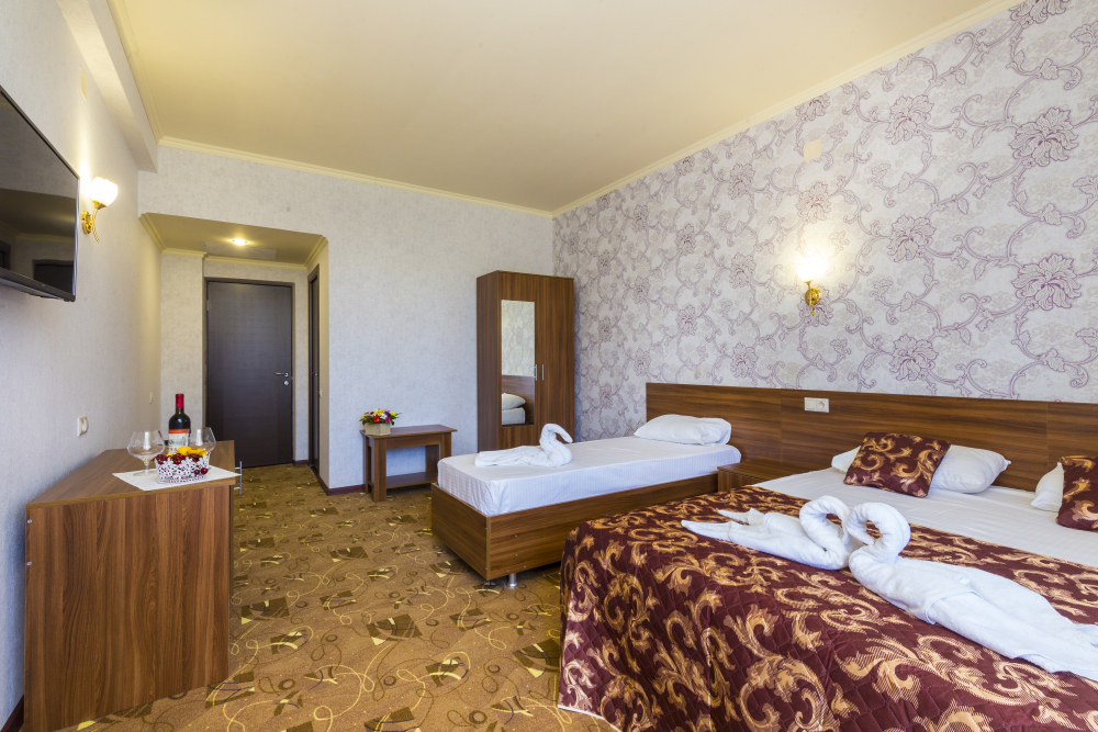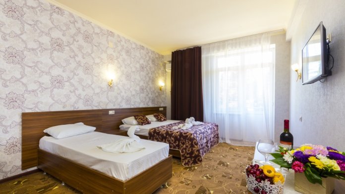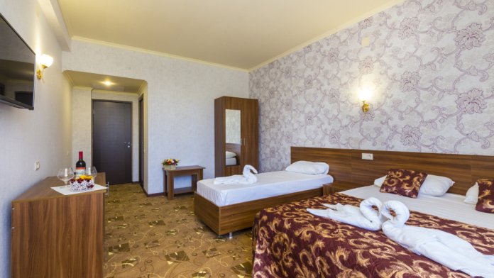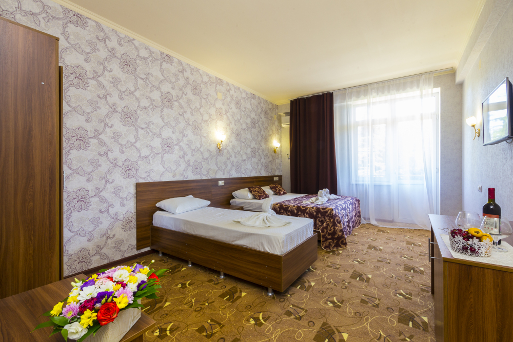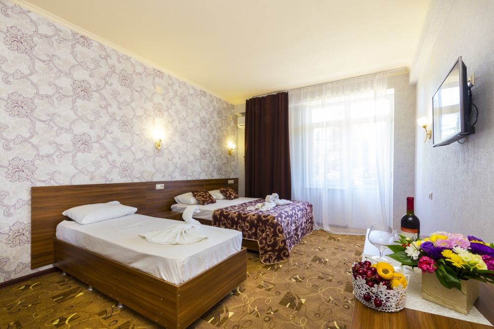 В отеле комфортные, стандартные номера с балконами и без. В каждом номере: телевизор, кондиционер, санузел, холодильник.