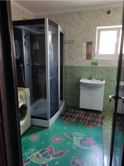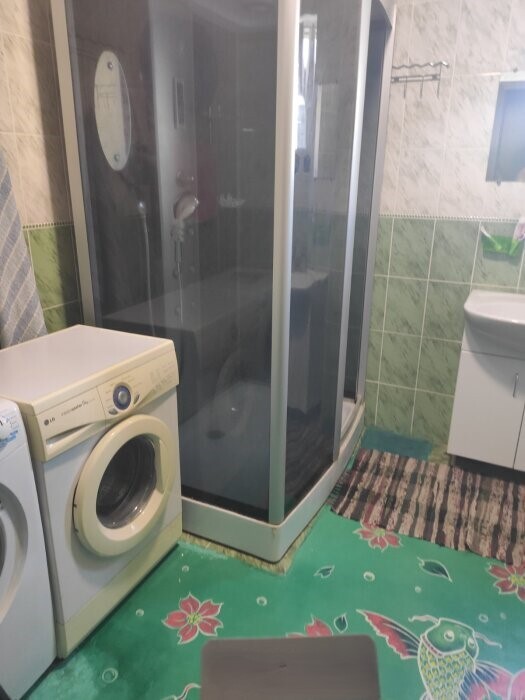 На кухне - вся кухонная мебель, посуда, газовая варочная поверхность, 2 холодильника, микроволновая печь, кондиционер. В сантехнической комнате - душевая кабина, стиральная машина и туалет.
