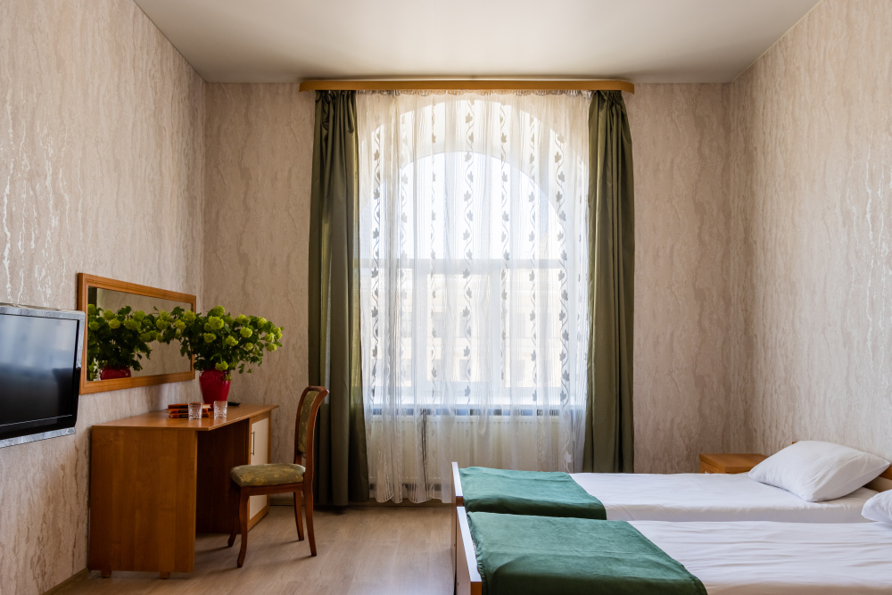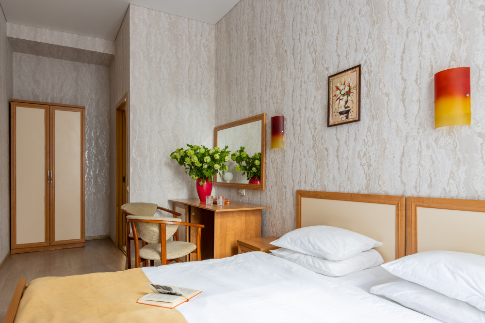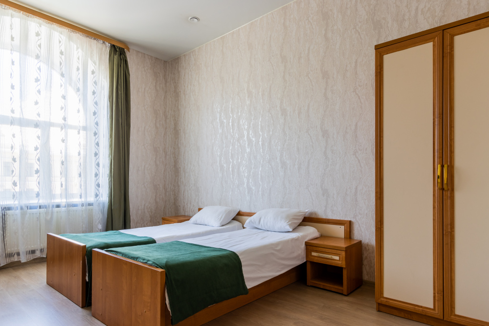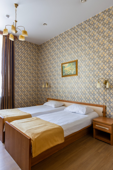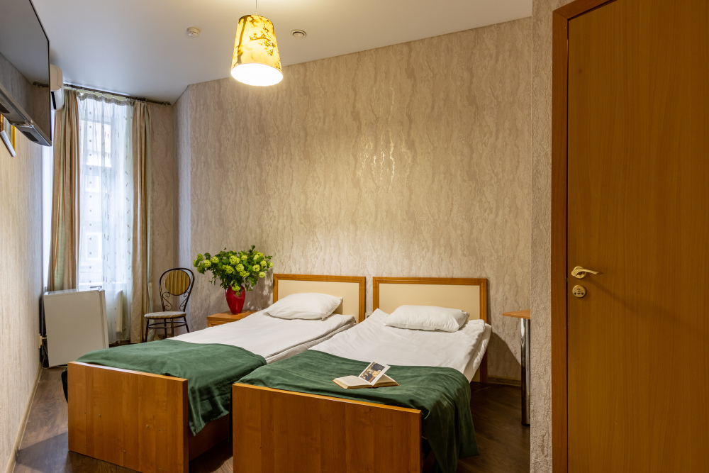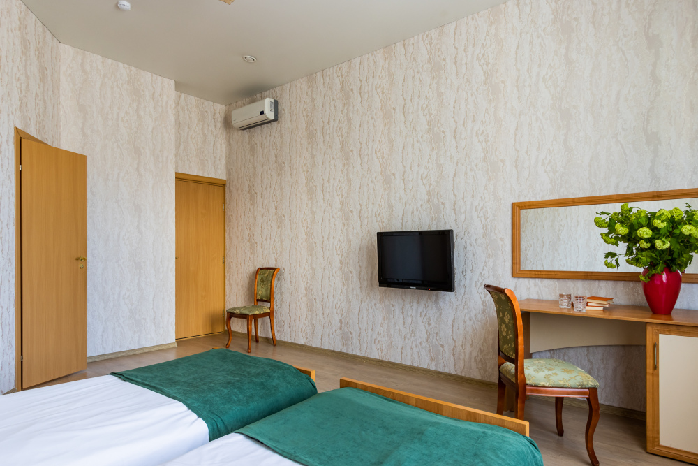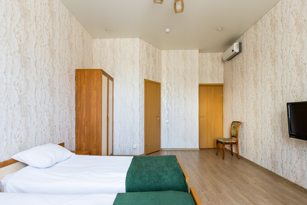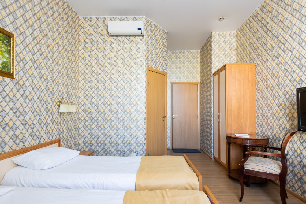 Номер оснащён всем необходимым для комфортного проживания: две односпальные кровати, высокоскоростной Wi-Fi, телевизор, кондиционер, шкаф, рабочее пространство, светонепроницаемые шторы, чистое и свежее постельное бельё и полотенца, фен, туалетно-косметические принадлежности, оборудованная ванная комната.