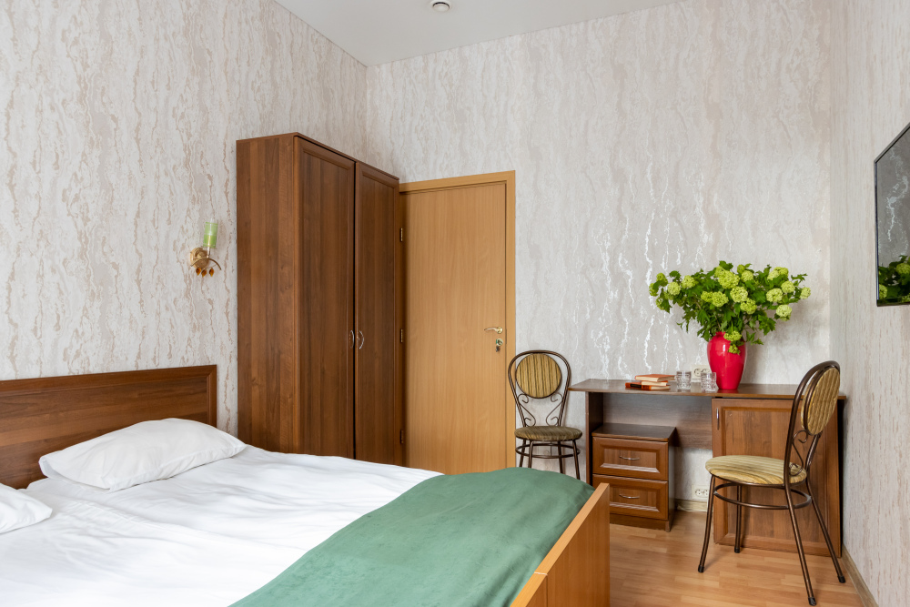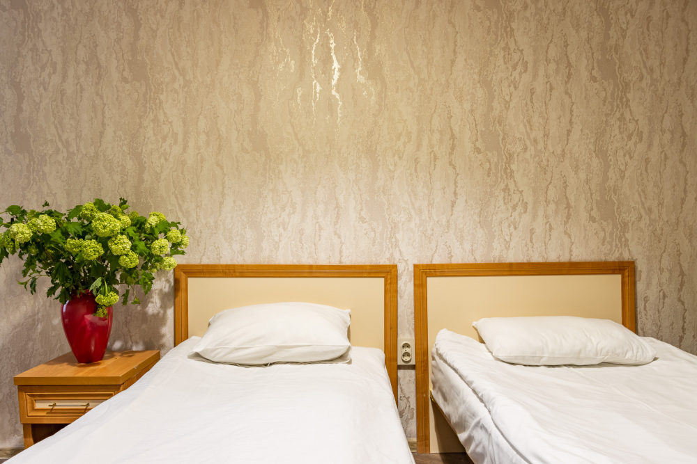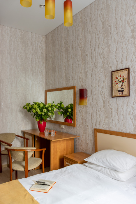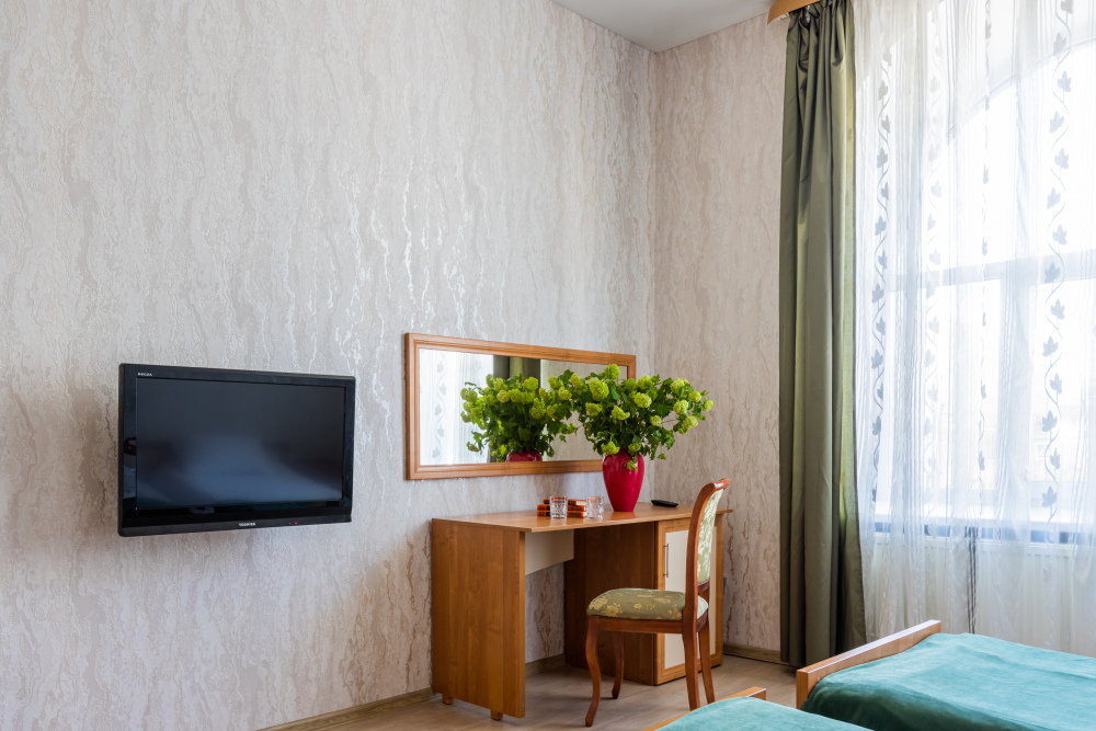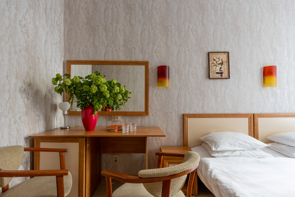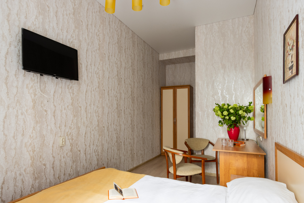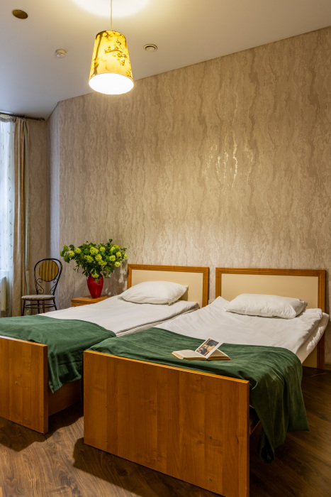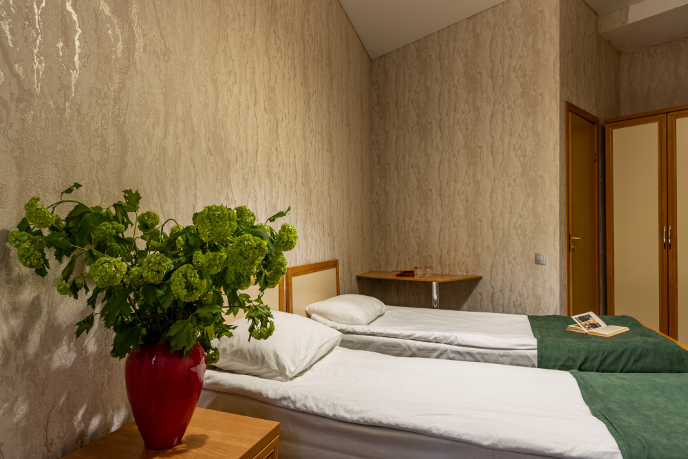 Номер оснащён всем необходимым для комфортного проживания: две односпальные кровати, высокоскоростной Wi-Fi, телевизор, кондиционер, шкаф, рабочее пространство, светонепроницаемые шторы, чистое и свежее постельное бельё и полотенца, фен, туалетно-косметические принадлежности, оборудованная ванная комната.