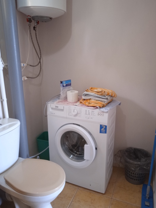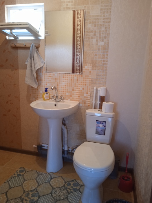 На первом этаже совмещенный санузел: раковина, унитаз, ванна, стиральная машина, горячая вода. На втором этаже отдельный санузел: раковина и унитаз.