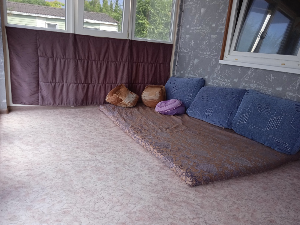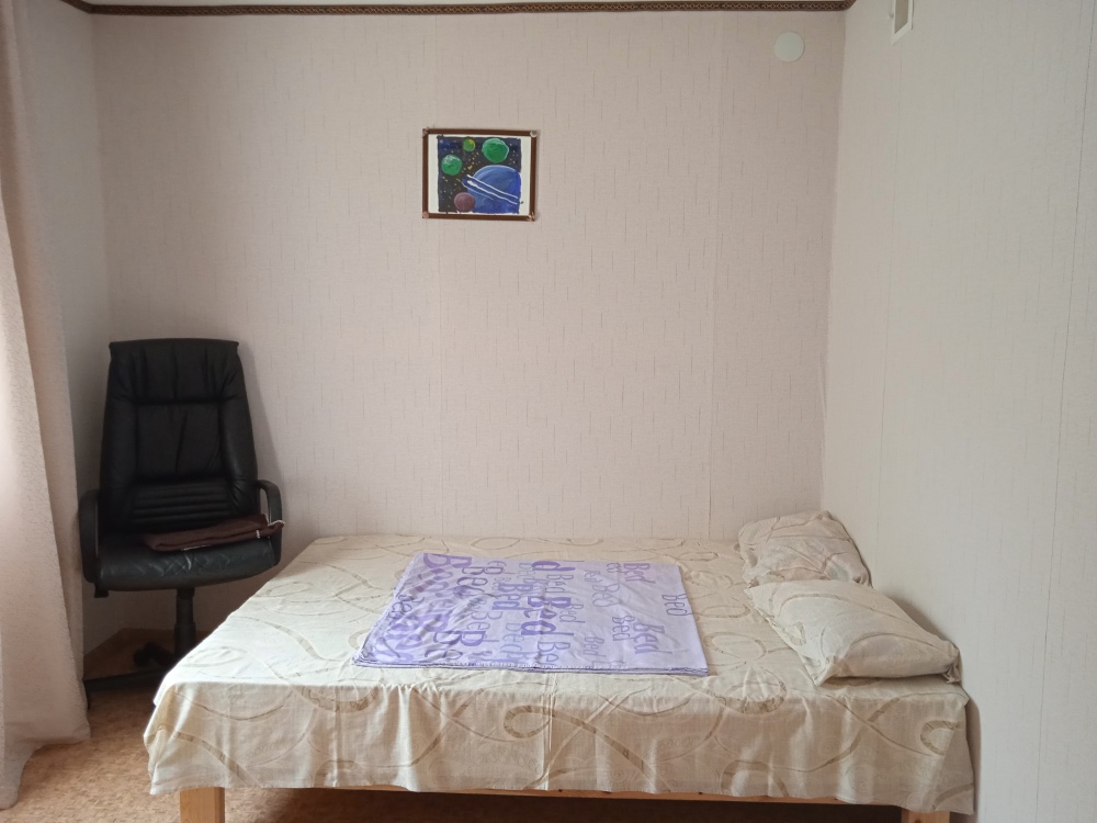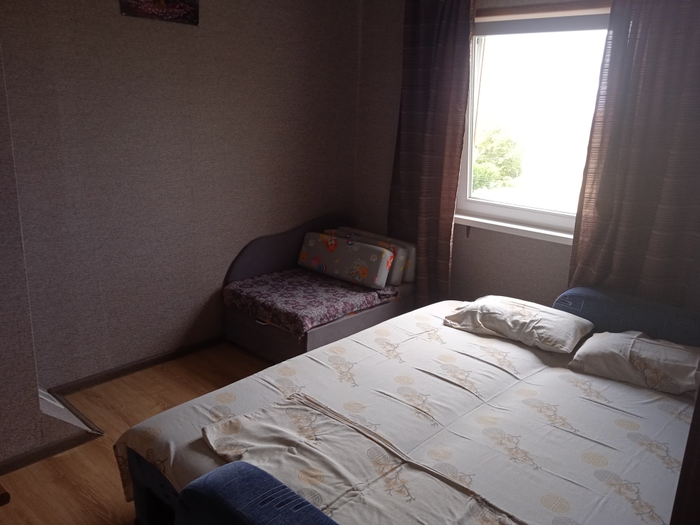 В доме три спальни. Одна комната с двухспальной кроватью. Во второй - большой двухместный диван и диванчик для ребенка.