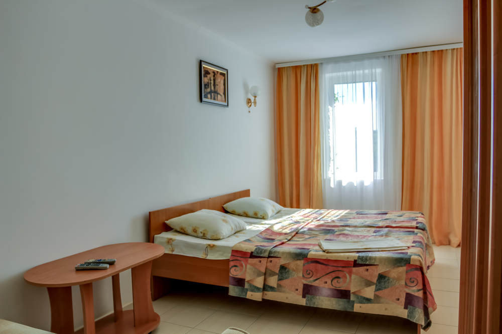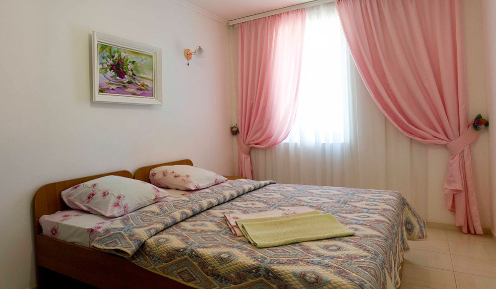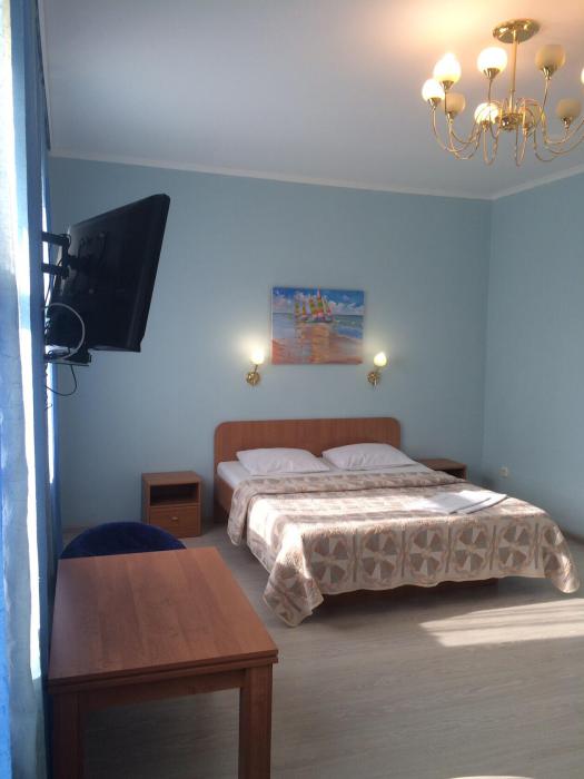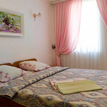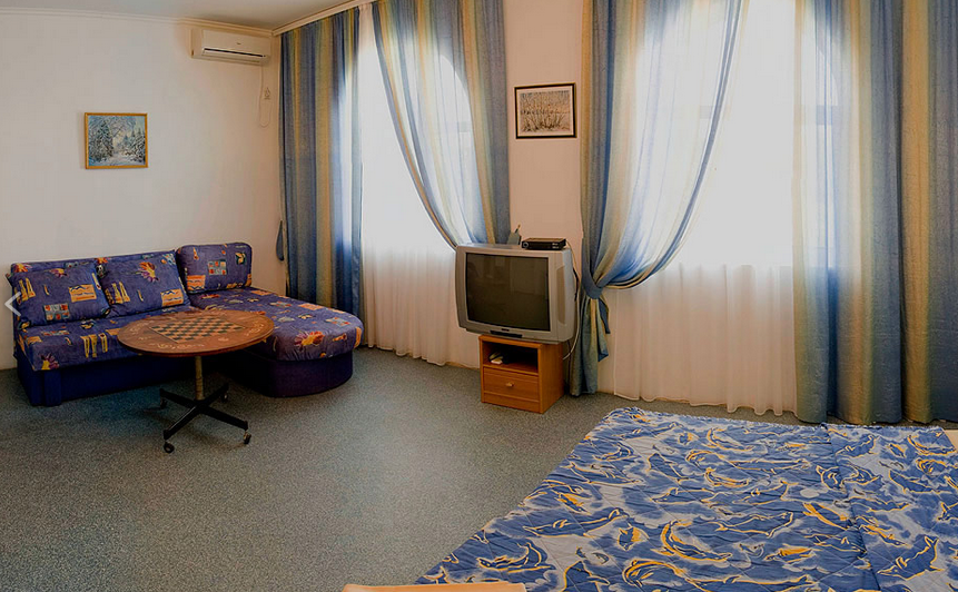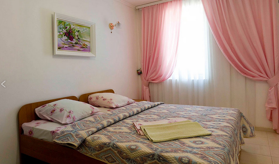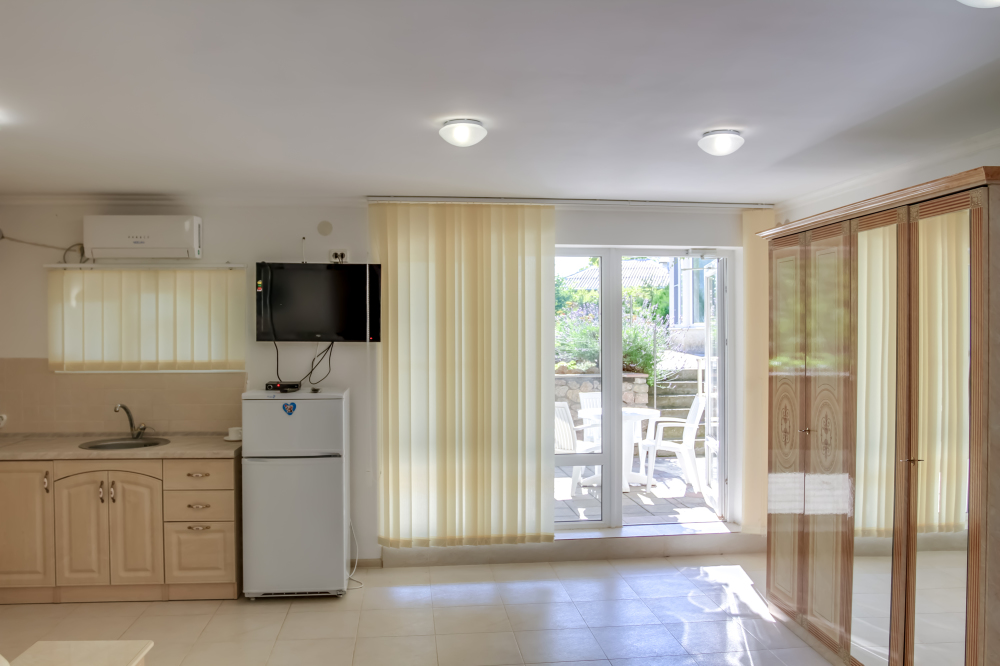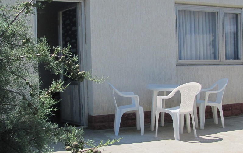Номера расположены в обособленном 1-этажном коттедже, разделенном на 4 комнаты. Перед входом в номера площадка с виноградной беседкой и обеденным столом, гостям выдается постельное белье и полотенце для душа, кухня общая (плита, кухонная мебель, холодильник, раковина, посуда).