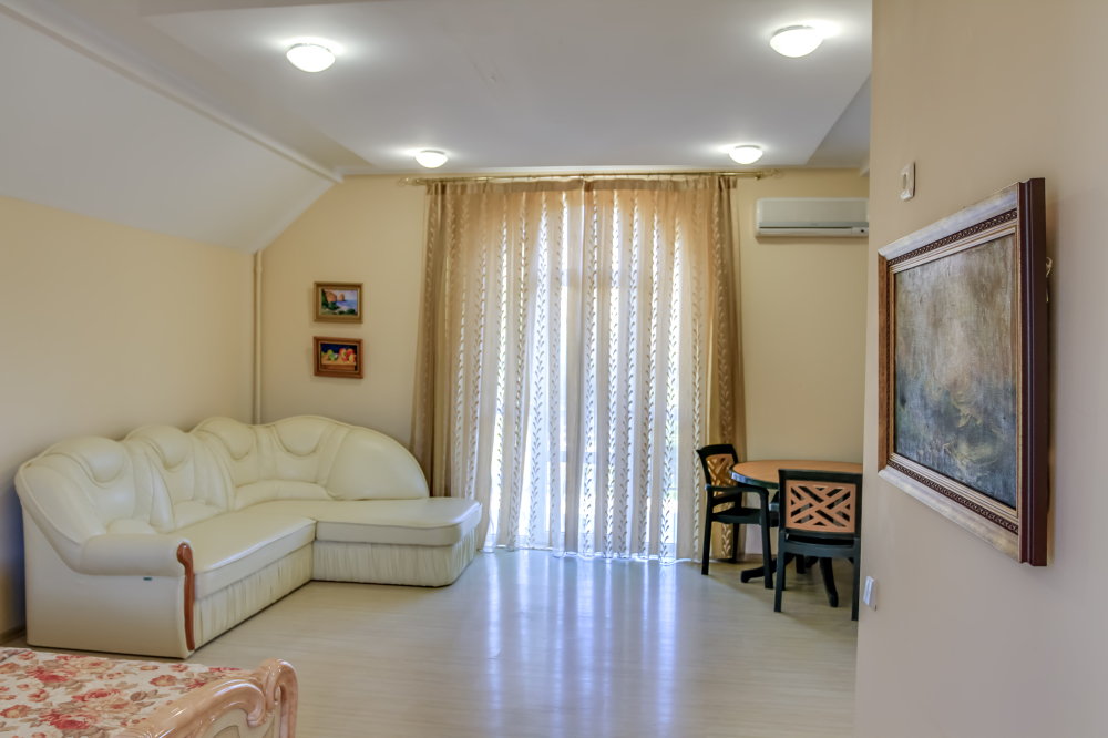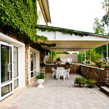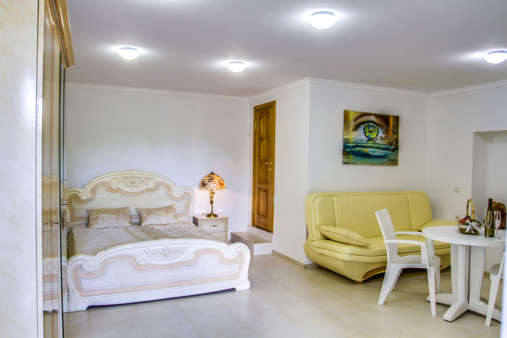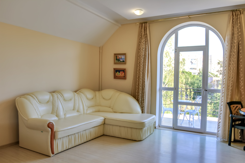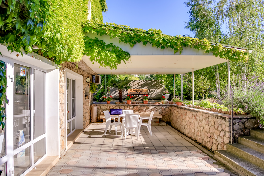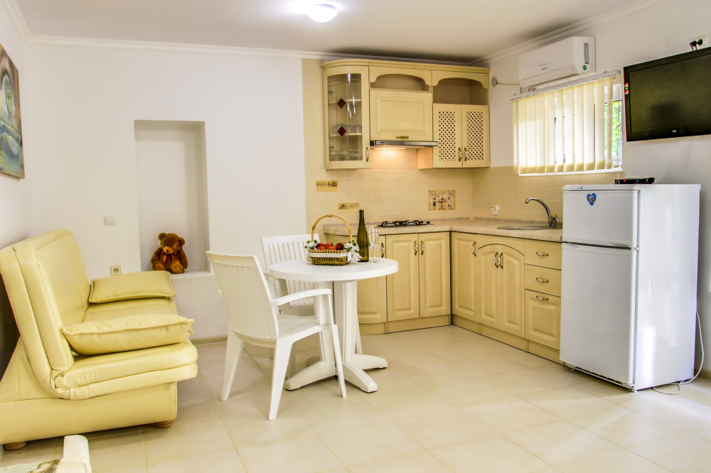 В гостевом доме предусмотрено все самое необходимое для того, чтобы семейный отдых на море оставил незабываемые впечатления. На территории есть несколько беседок для отдыхающих, обвитых ветвями сортового винограда. Отличительной особенностью гостевого дома является большая, очень красивая и уютная зеленая зона, где растут экзотические пальмы, знаменитый крымский можжевельник и множество видов плодовых деревьев, таких как персик, инжир, слива.