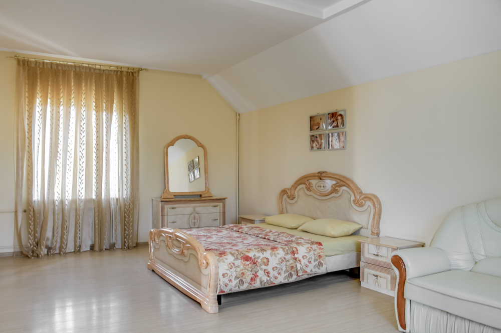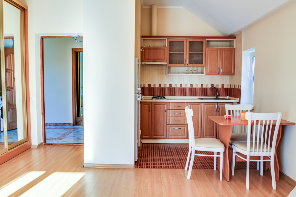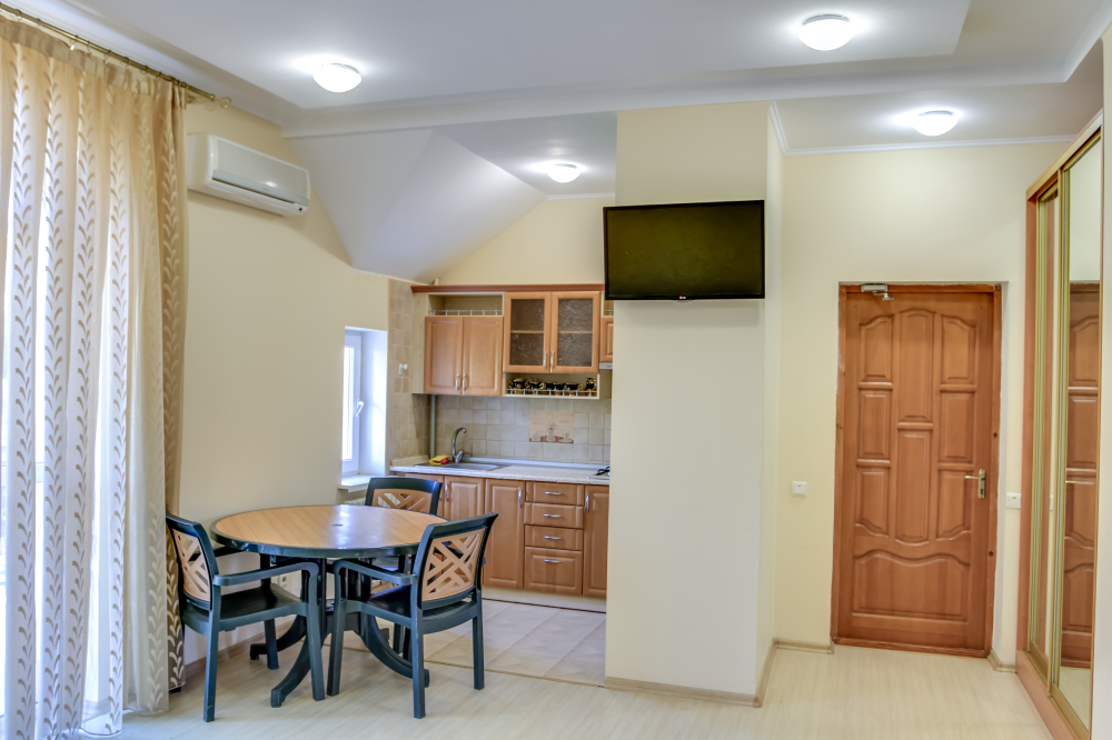 В номере есть кухня с посудой, шкаф-купе, тумбочки, шкаф, комод с зеркалом, стол со стульями.