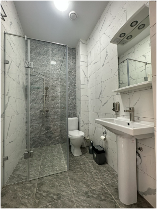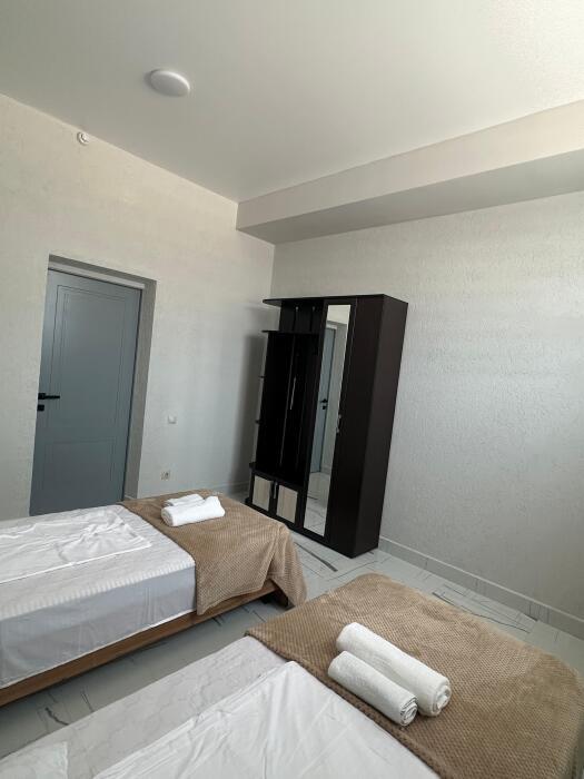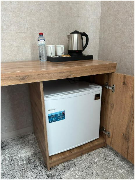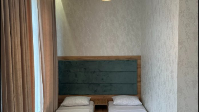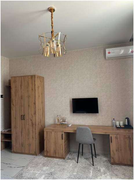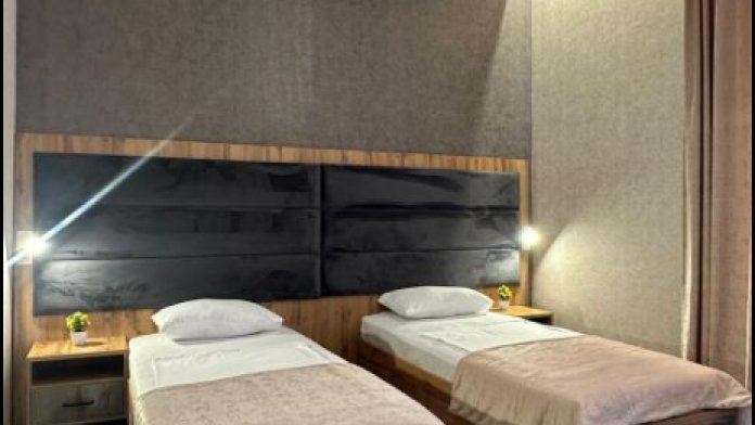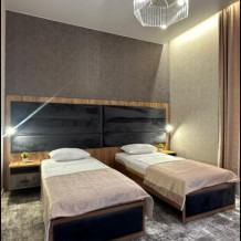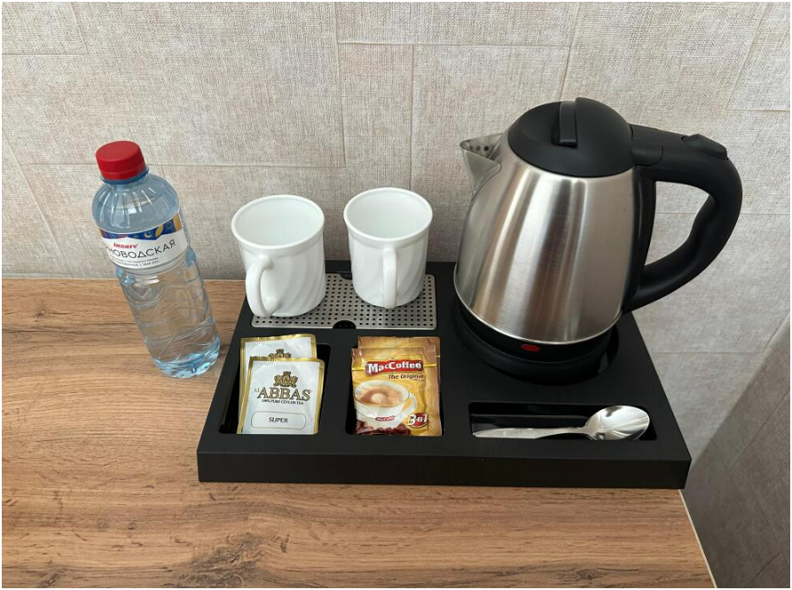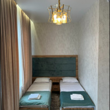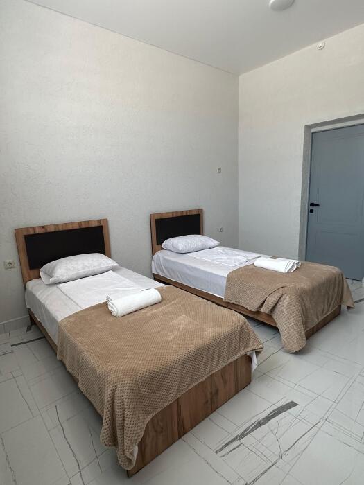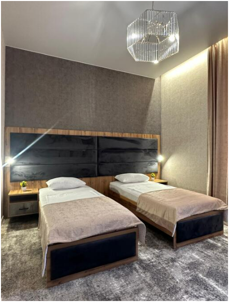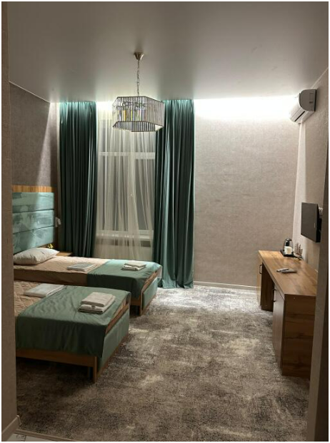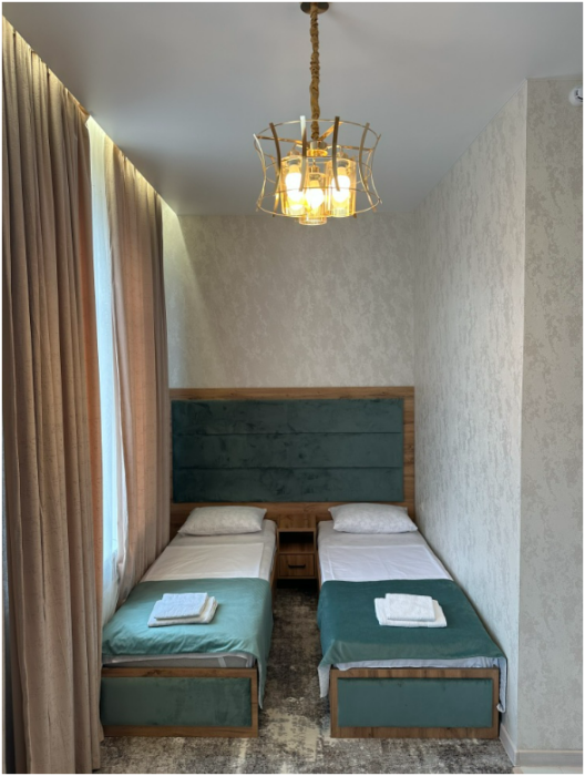 В номере односпальные кровати, ванная комната, телевизор, кондиционер, холодильник, электрический чайник.