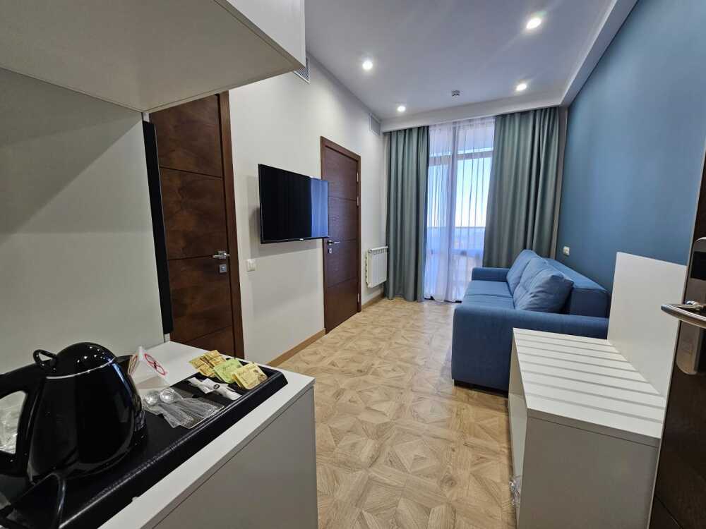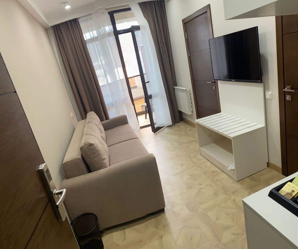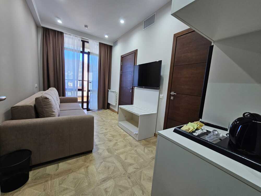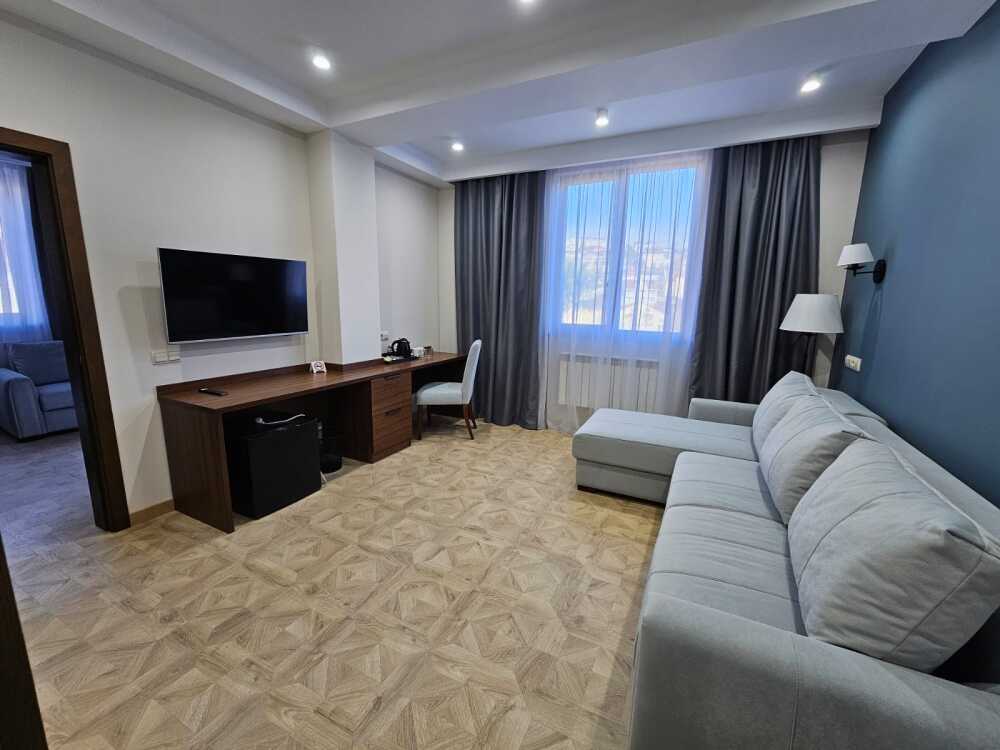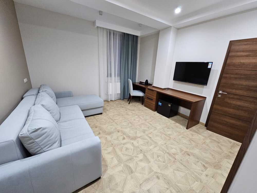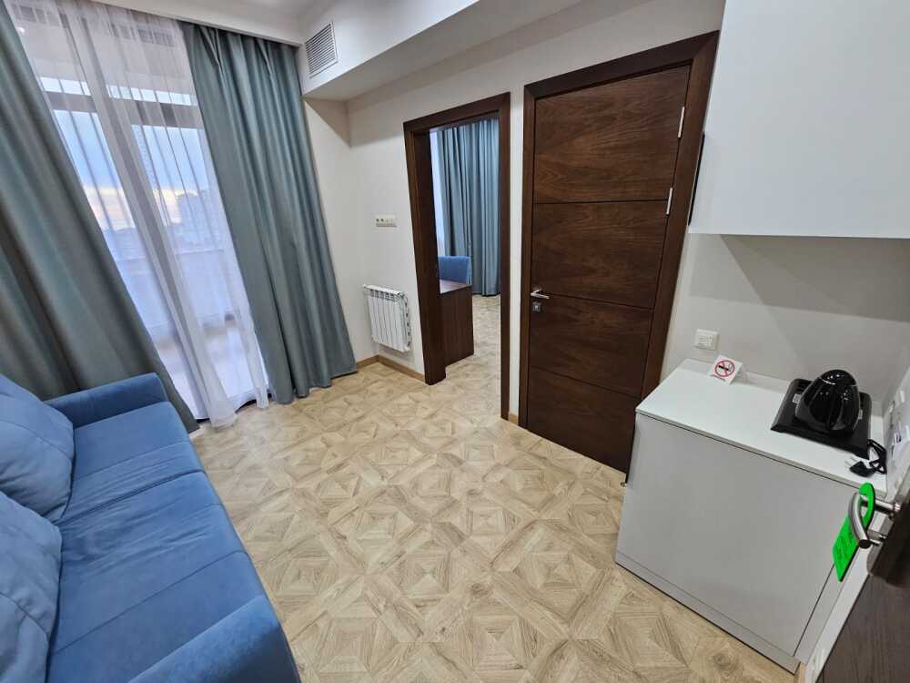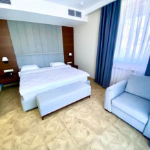 Комфортный двухкомнатный номер с балконом площадью 40-45 кв.м с одной двуспальной кроватью 180*200 см и двуспальным диваном. Номер оснащен двумя TV 45', кондиционером, телефоном, чайной станцией и холодильником. В ванной комнате с подогреваемым полом и современной душевой кабиной есть фен и необходимые гигиенические принадлежности