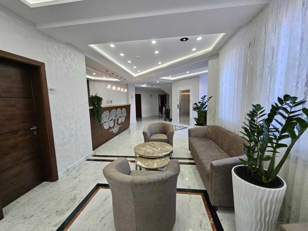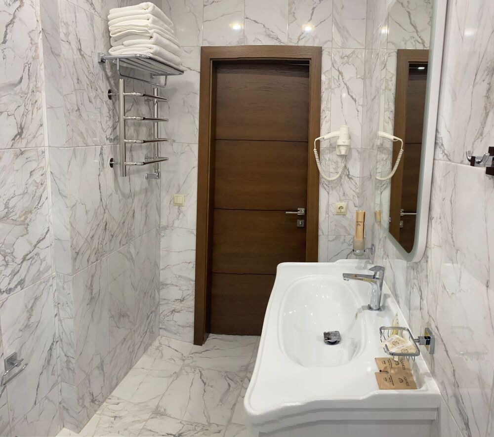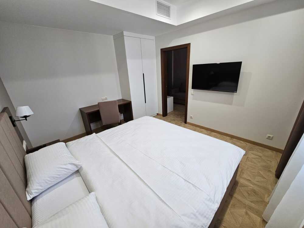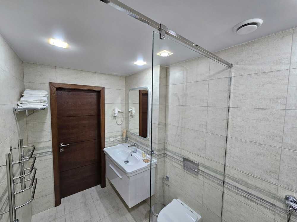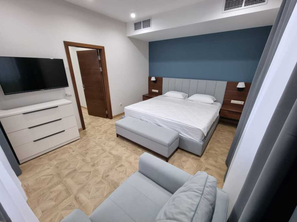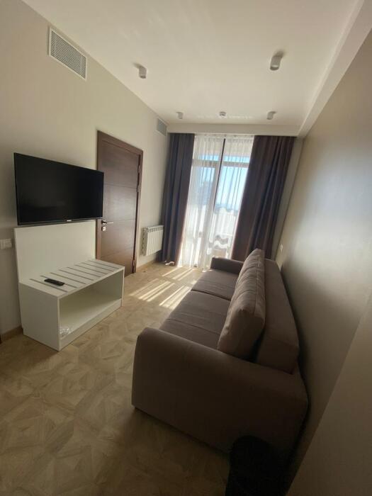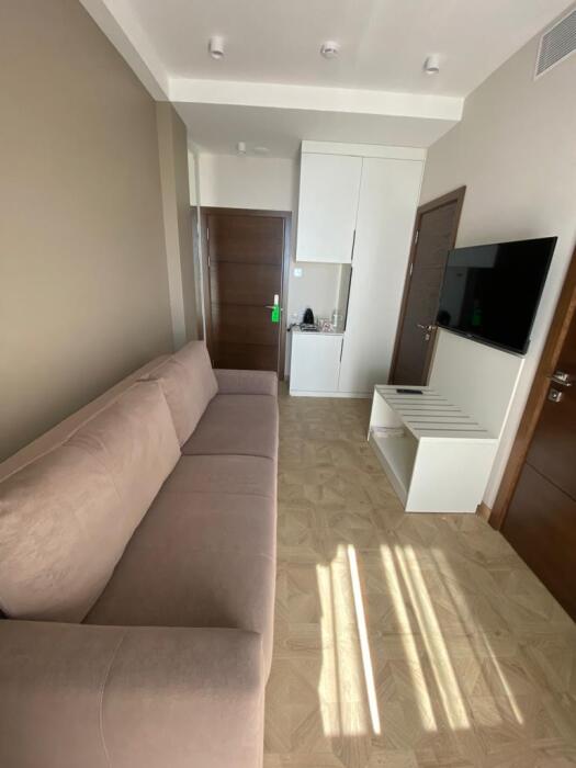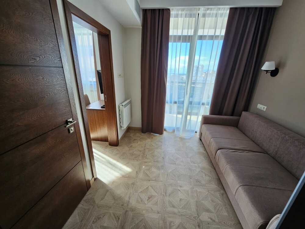 Комфортный двухкомнатный номер с балконом площадью 40-45 кв.м с одной двуспальной кроватью 180*200 см и двуспальным диваном. Номер оснащен двумя TV 45', кондиционером, телефоном, чайной станцией и холодильником. В ванной комнате с подогреваемым полом и современной душевой кабиной есть фен и необходимые гигиенические принадлежности