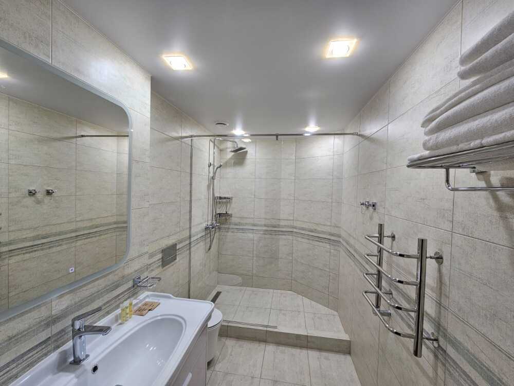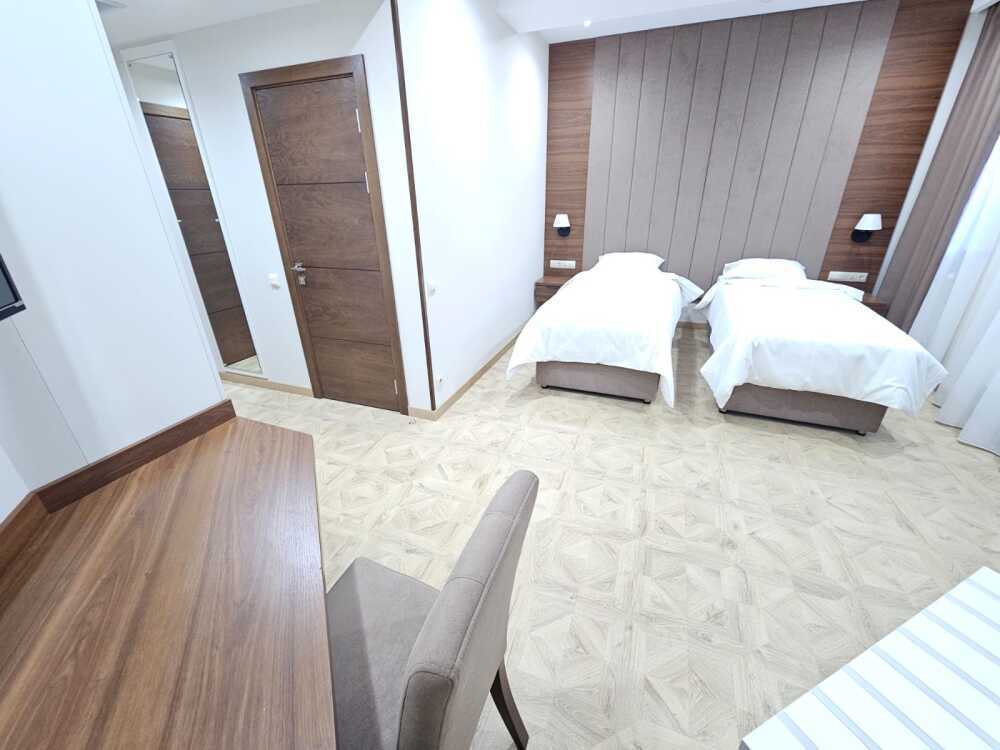 Просторный двухкомнатный номер площадью 40 кв.м с одной двуспальной кроватью 140*200 см или двумя отдельно стоящими кроватями размером 90*200 см каждая. Номер оснащен двумя TV 45', кондиционером, телефоном, чайной станцией и холодильником. В ванной комнате с подогреваемым полом и современной душевой кабиной есть фен и необходимые гигиенические принадлежности