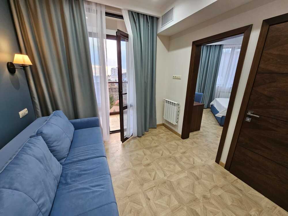 Двухкомнатный номер с балконом площадью 30-40 кв.м с одной двуспальной кроватью 160*200 см и двуспальным диваном. Номер оснащен TV 32-45', кондиционером, телефоном, чайной станцией и холодильником. В ванной комнате с подогреваемым полом и современной душевой кабиной есть фен и необходимые гигиенические принадлежности