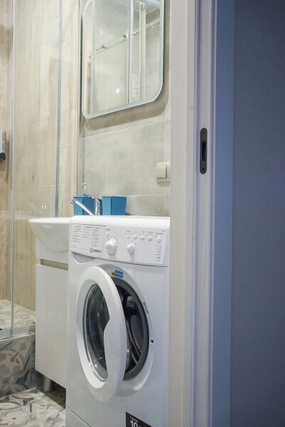 В студии полностью оборудованная мини-кухня с микроволновой печью, гостиный уголок, телевизор с плоским экраном, стиральная машина и собственная ванная комната с душем и тапочками. Также имеются холодильник, плита, чайник.