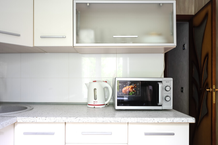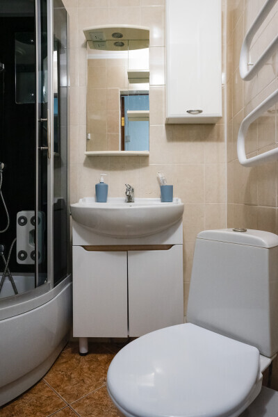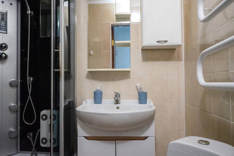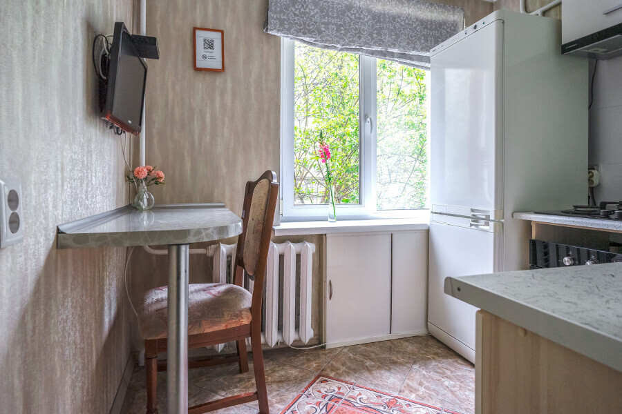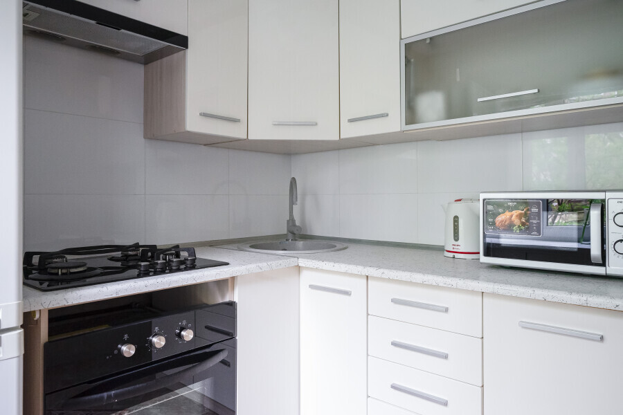 В квартире полностью оборудованная кухня с микроволновой печью, гостиный уголок, телевизор с плоским экраном, стиральная машина и собственная ванная комната с душем и тапочками. Также имеются холодильник, плита, чайник.