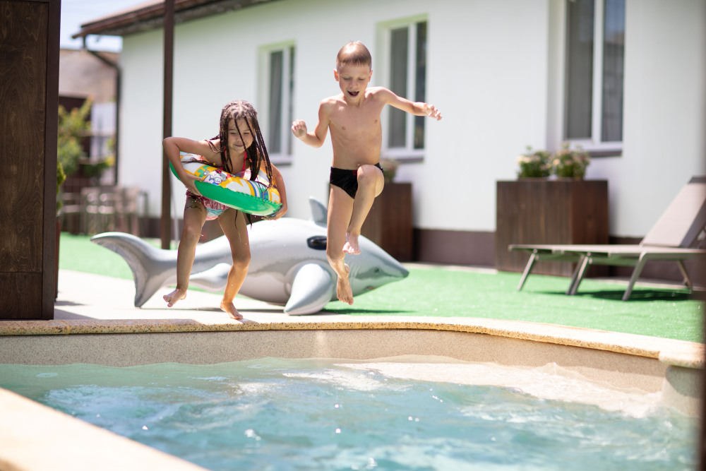 Современный открытый бассейн с подогревом и противотоком (работает с мая по октябрь с 8:00 до 22:00)- идеален для тренировок и релакса.