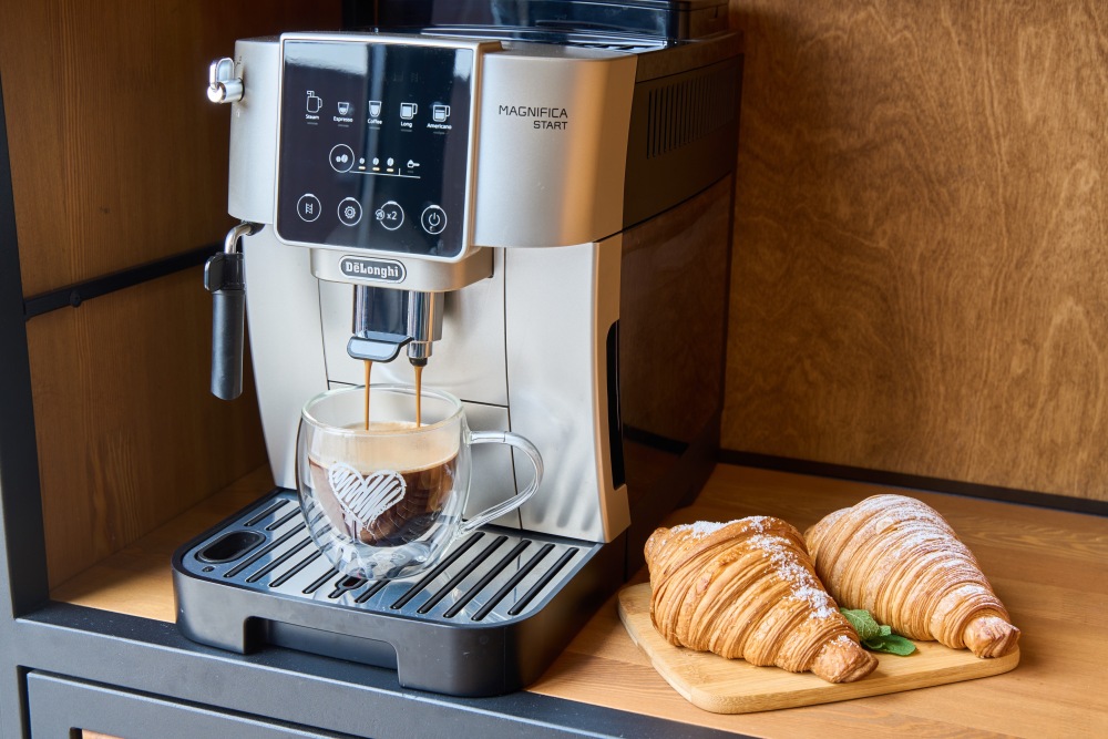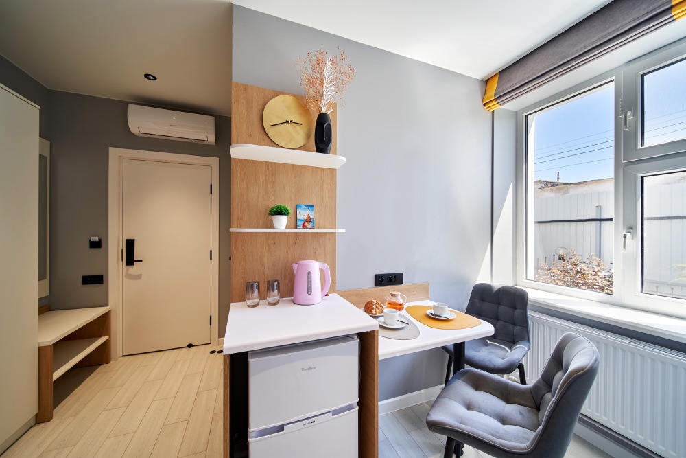 - В номерах с кухонной зоной: кофемашина, варочная панель, фильтр для воды.