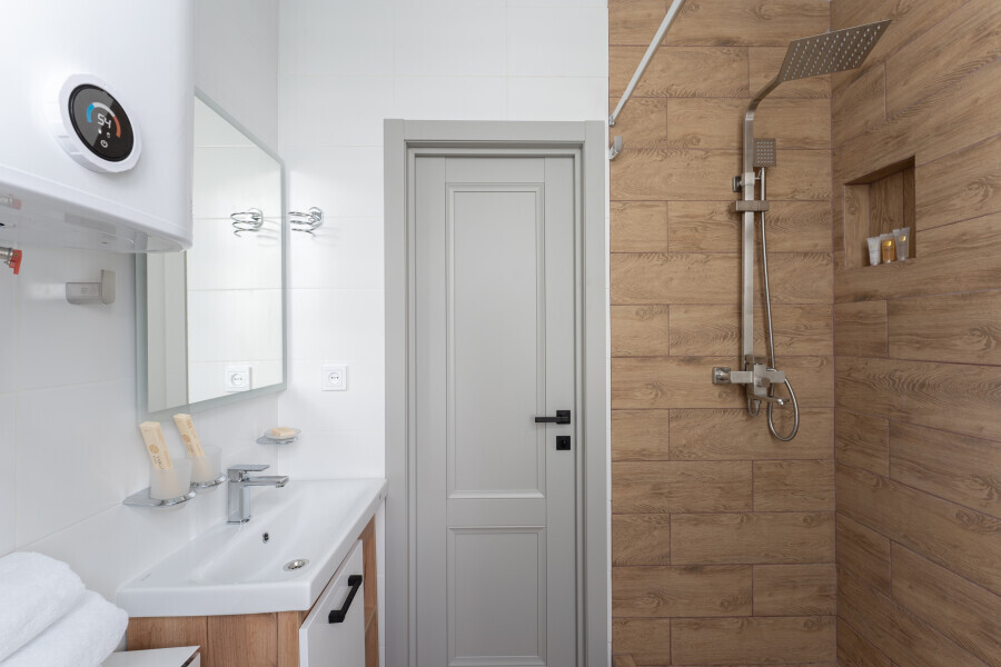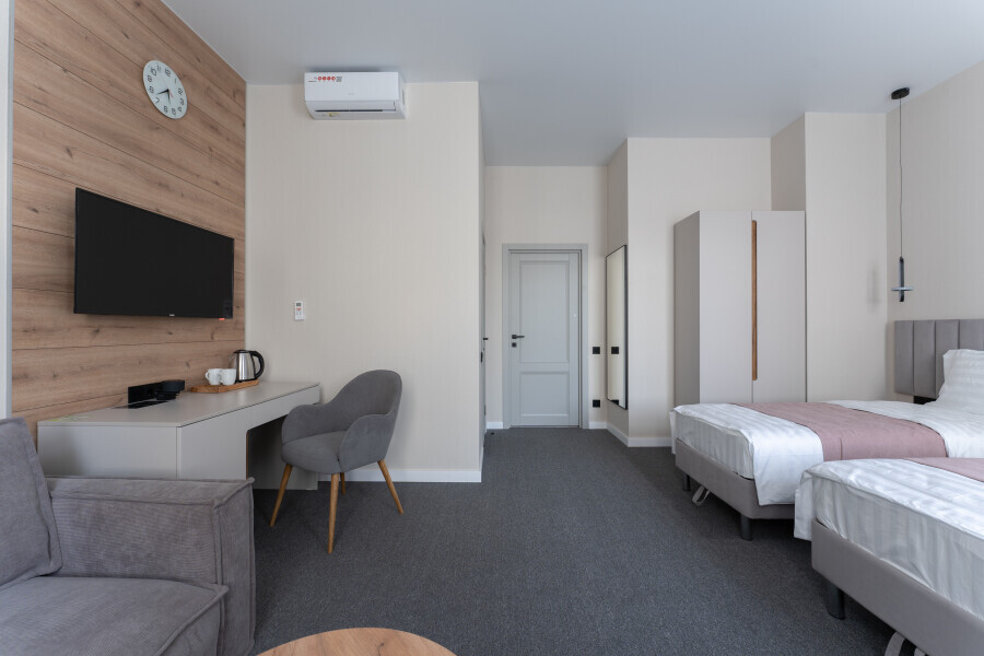 Оснащен Яндекс станция Алиса с функцией инфоконсьерж, TV управляемое Алисой, wi-fi, кондиционер, сейф, холодильник, гардеробный шкаф, письменный стол, стул, душевая комната, приборы гигиенической косметики, фен, белье премиального качества.