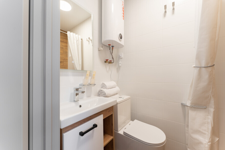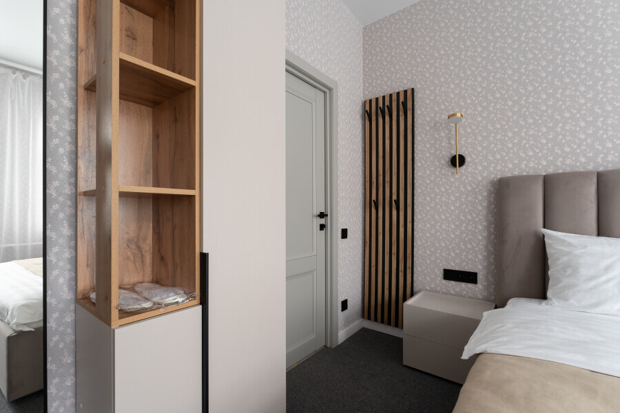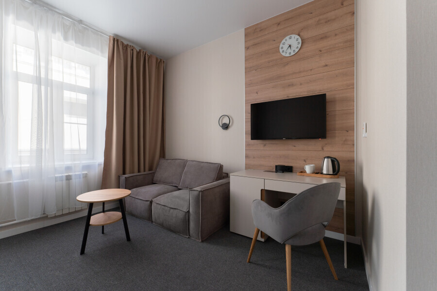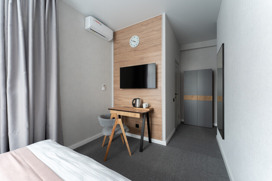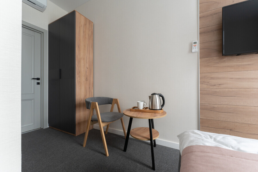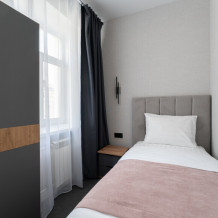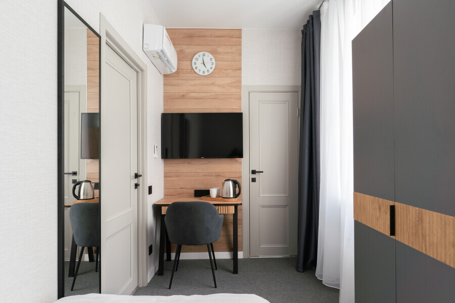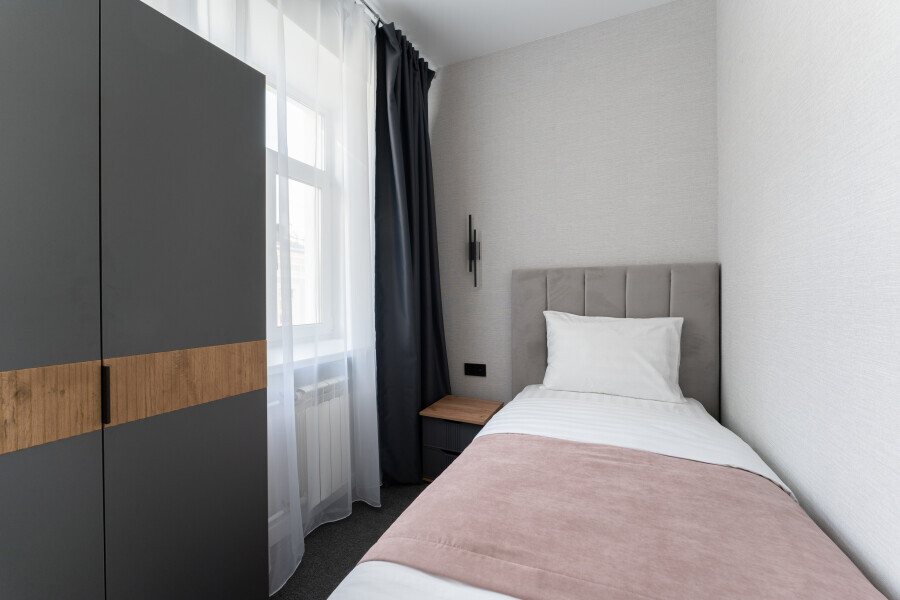 Оснащен: односпальная кровать 90/200, Яндекс станция Алиса с функцией инфоконсьерж, TV и аудио, wi-fi, кондиционер, холодильник, сейф, гардеробный шкаф, письменный стол, стул, душевая комната, приборы гигиенической косметики, фен, белье премиального качества.