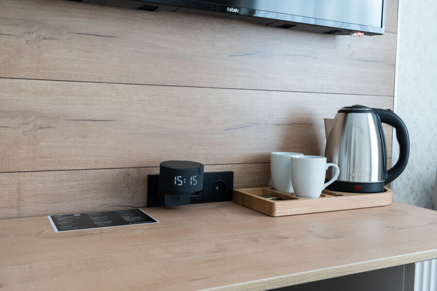 Интегрирован с Яндекс станцией Алиса, которая поможет сэкономить ваше время, расскажет все об отеле, как подключить Wi-Fi в номере, включит/выключит аудио, разбудит вас в нужное время. Также Алиса подскажет, как отправить запрос администратору.