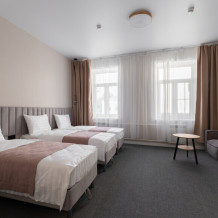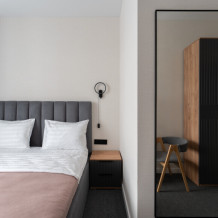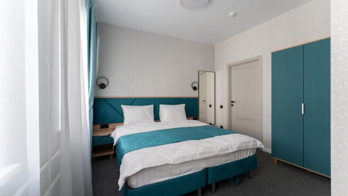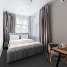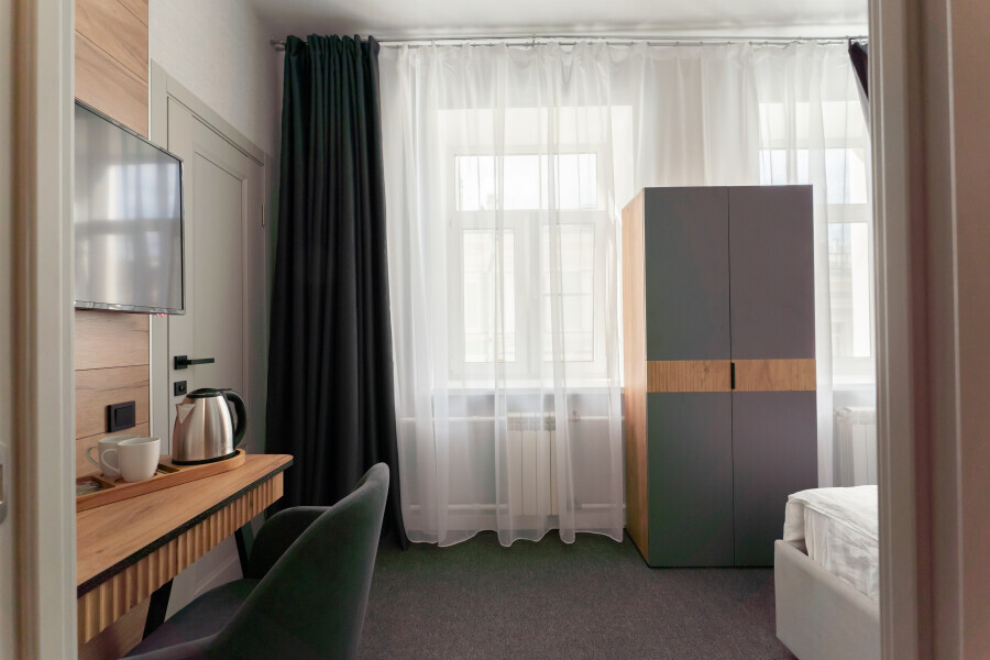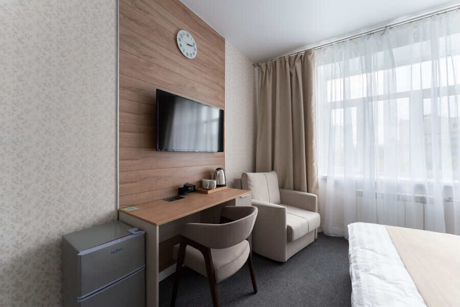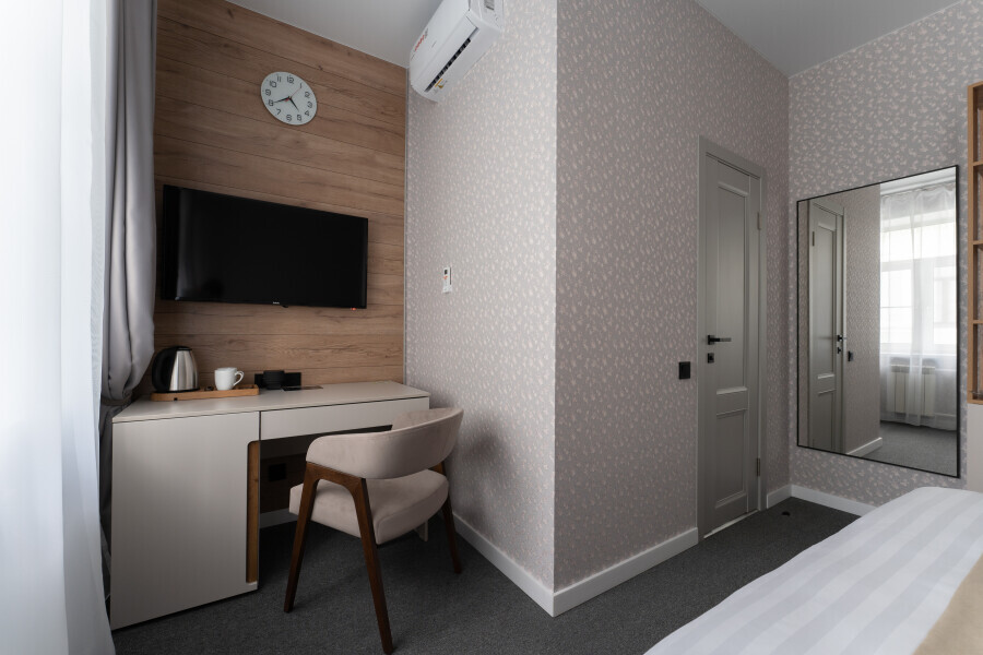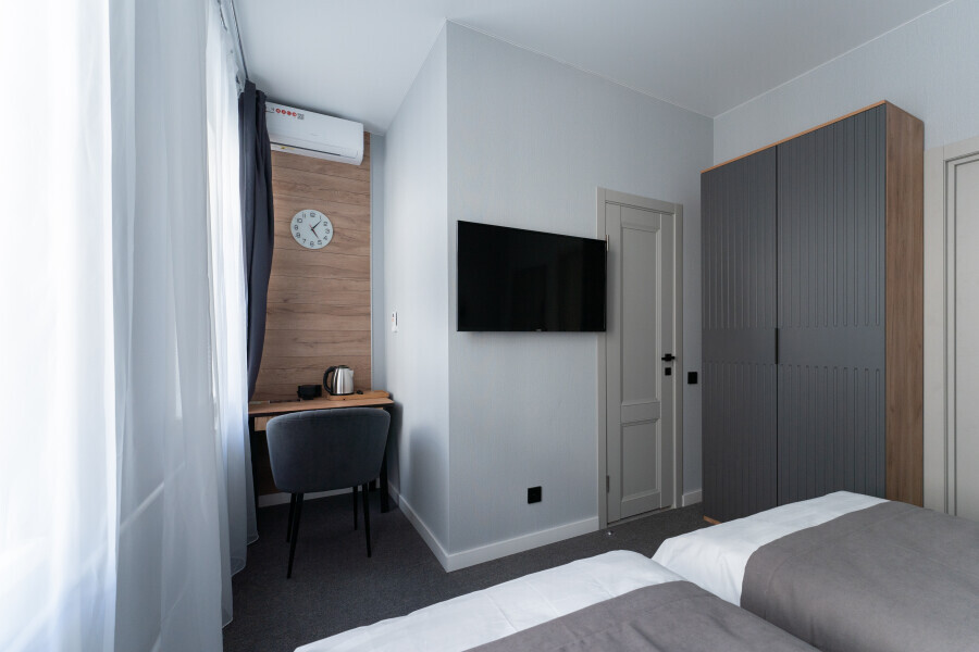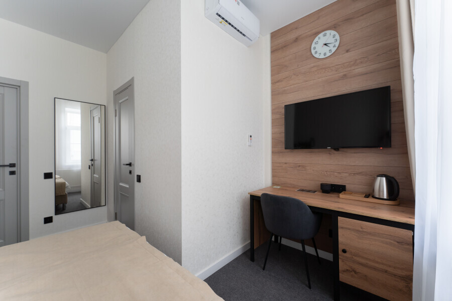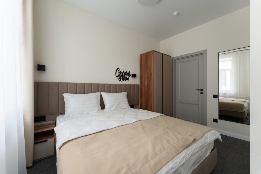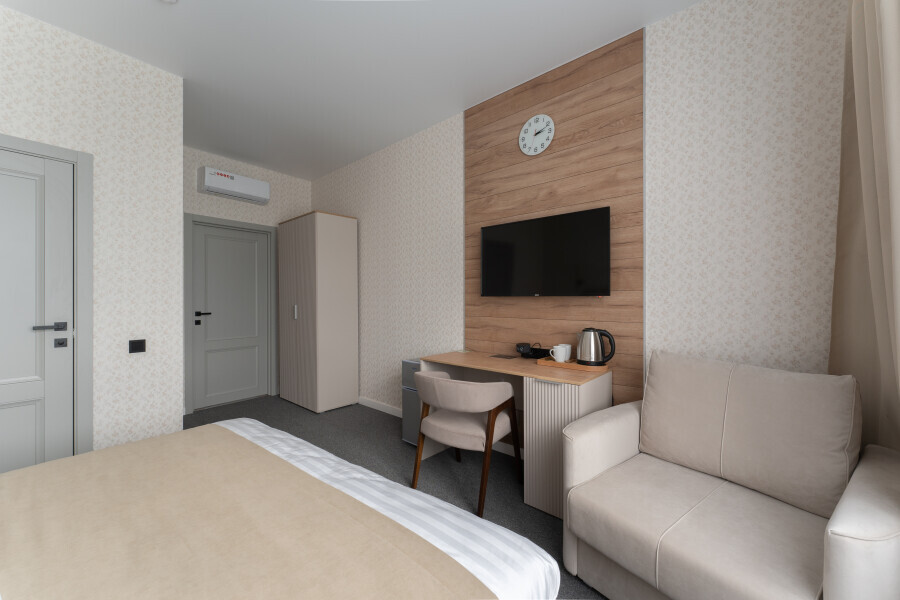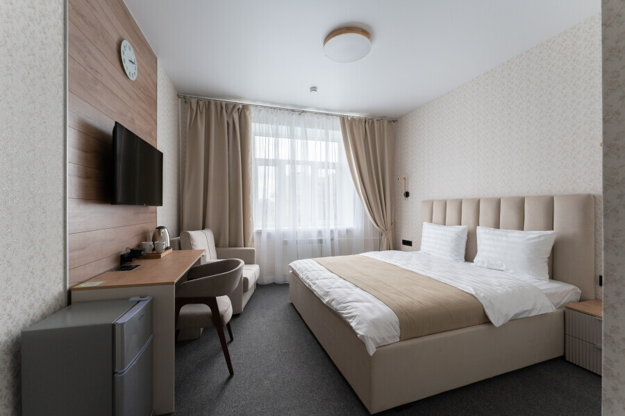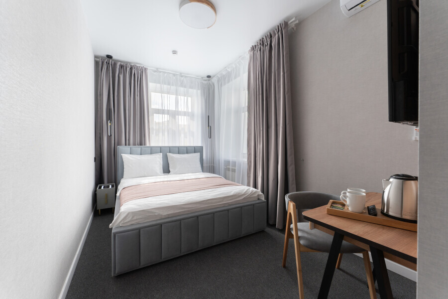 Номер с одной большой или двумя раздельными кроватями на выбор гостя. Окна выходят в тихий внутренний дворик. Оснащен Яндекс станция Алиса с функцией инфоконсьерж, TV управляемое Алисой, wi-fi, кондиционер, сейф, холодильник, гардеробный шкаф, письменный стол, стул, душевая комната, приборы гигиенической косметики, фен, белье премиального качества.