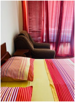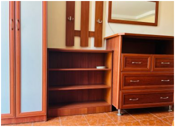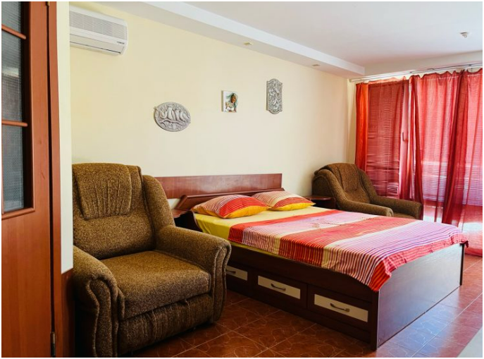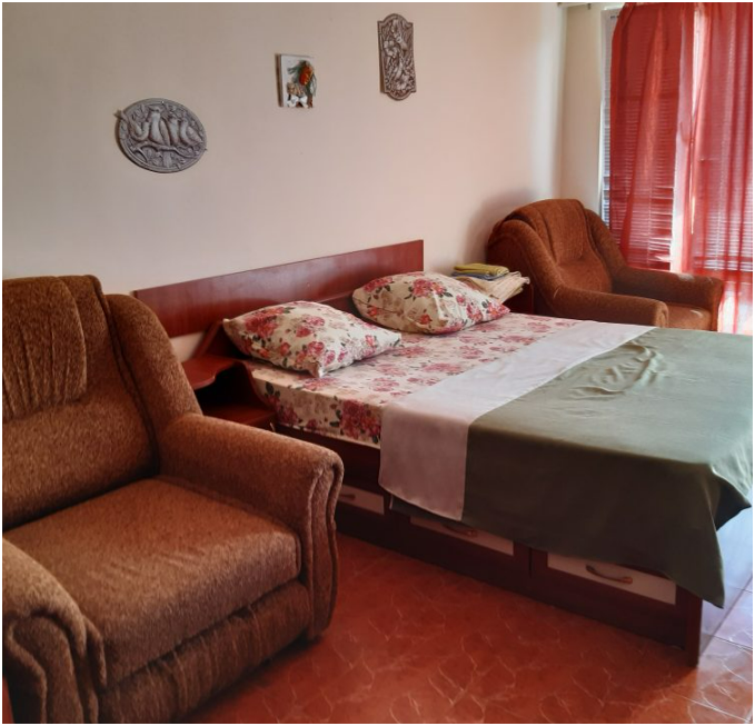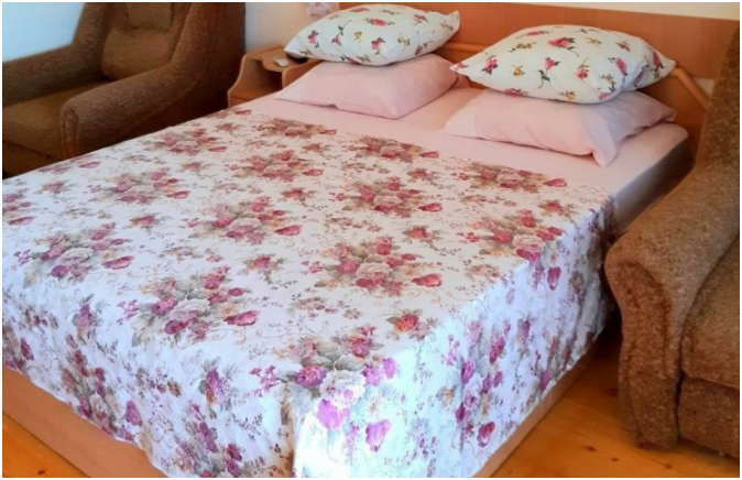 Большая двуспальная кровать с ортопедическим матрасом и 2 раскладных кресла, комод, тумбочки, шкаф, вешалка, стол со стульями.