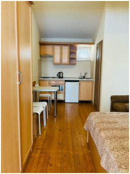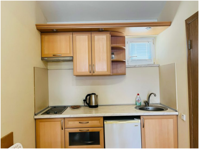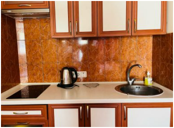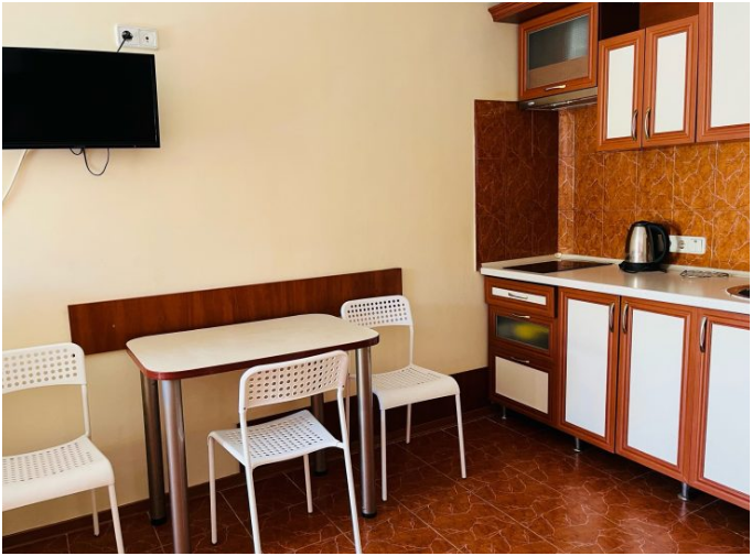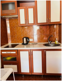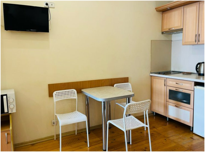 холодильник, кухня с электроплитой и кухонными принадлежностями (набор столовой посуды и приборы, кастрюли и сковорода), микроволновая печь, электрочайник.