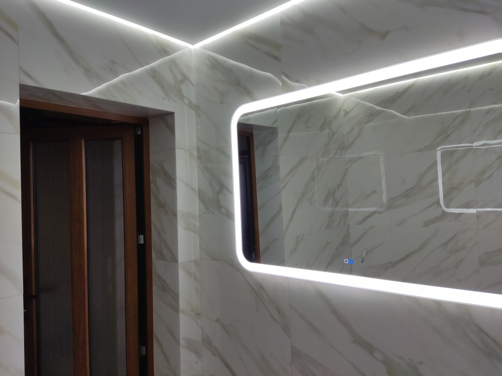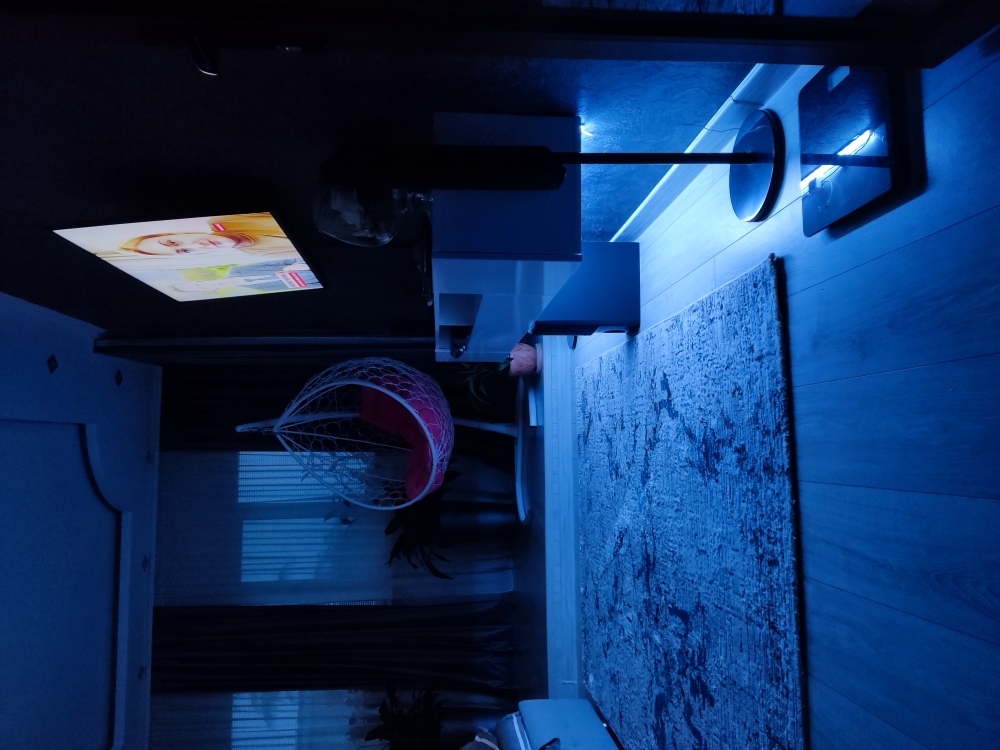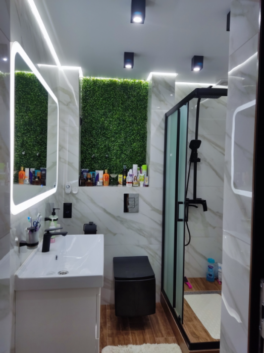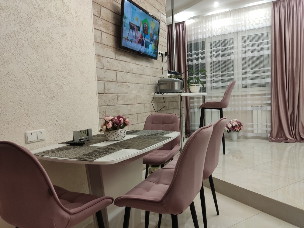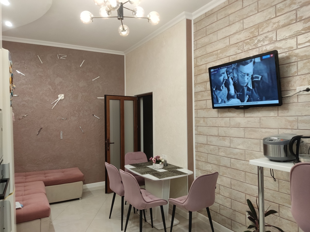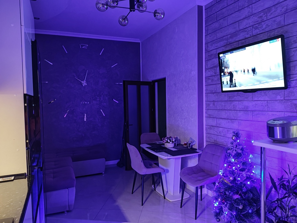 В каждой комнате (на полу, потолке, кухне, тумбах и даже в санузле) имеются led-подсветки, всё очень красиво светится в вечернее время, придавая романтическую обстановку. Гламурность помещению придаёт искусственная и натуральная зелень, представленная большим настенным панно, отдельными экибанами и красивыми напольными кашпо. Так же в помещении для релаксации есть аквариум с декоративными рыбками. На окнах везде москитные сетки и жалюзи. Санузел совмещённый, выложен плиткой 120 на 90 мрамор, чёрная сантехника подчёркивает элегантность помещения, имеется тропический и гигиенический душ.