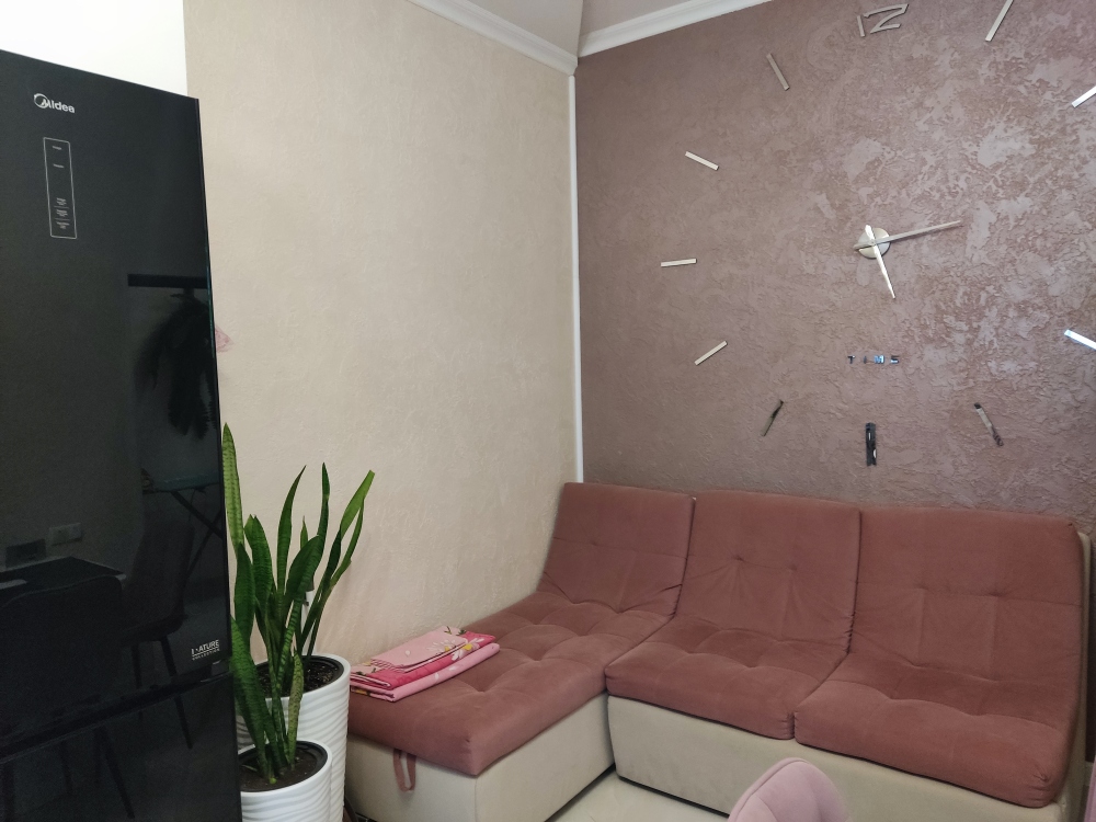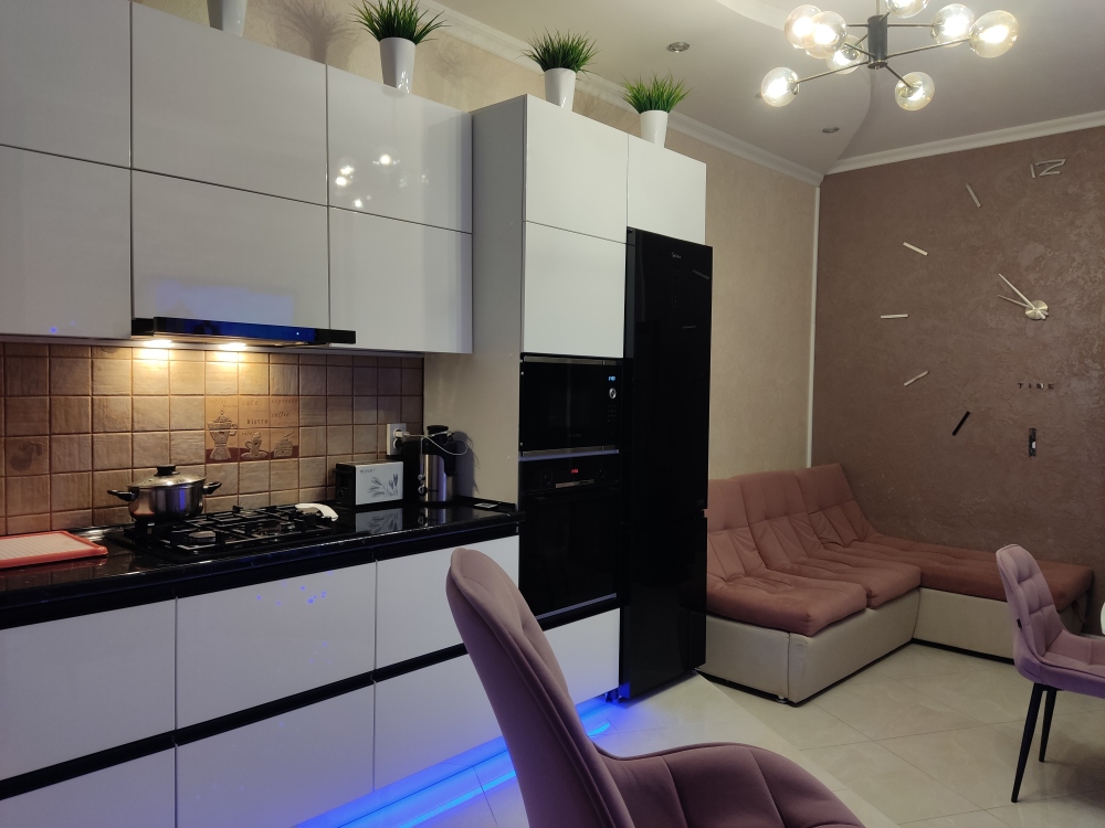В каждой комнате имеются японские кондиционеры, большие плазменные телевизоры Самсунг нового поколения 4к 55 диагональ со смарт ТВ, вай-фай. Имеется домашний кинотеатр Sony с акустической системой, стиральная машина 3д Lg с встроенной сушкой. Варочная поверхность, духовой шкаф, холодильник, пароутюг, соковыжималка, и другая техника фирмы Bosch, вся техника из чёрного стекла, контрастно сочетающаяся с белой глянцевой кухонной мебелью. Имеется система очищения воды Osmos. Мягкие пудровые велюровые кресла и шторы на кухне также сочетаются с декоративным камнем и декоративной штукатуркой, на которой пикантно смотрятся большие настенные часы.