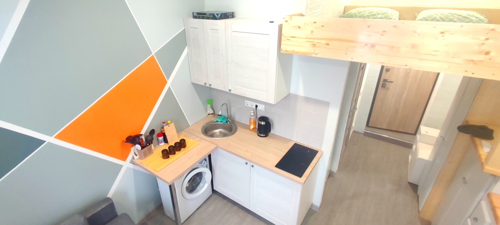 Отделка качественными материалами. Все функционально, с соблюдением эргономики пространства. На второй уровень, где расположена спальное место 160х200, ведет удобная лестница.