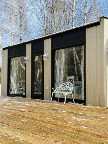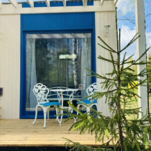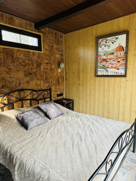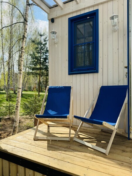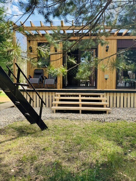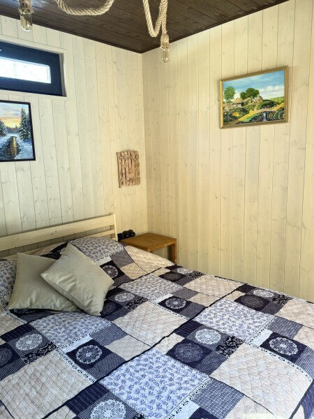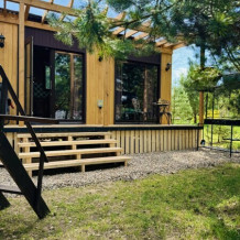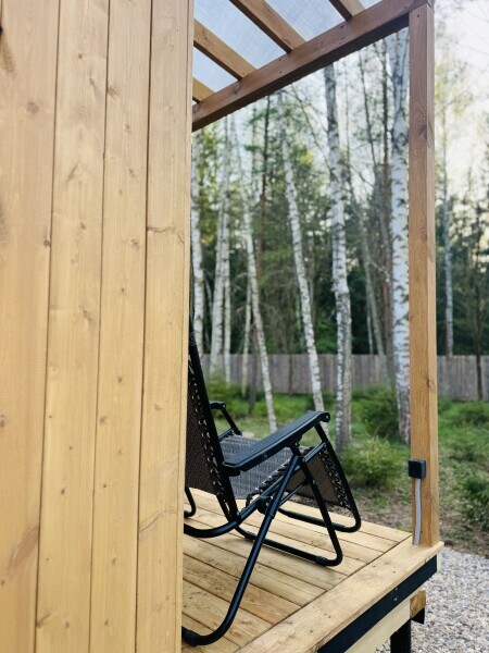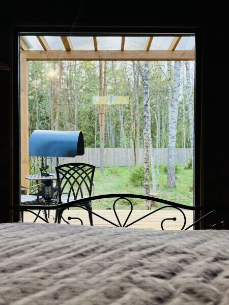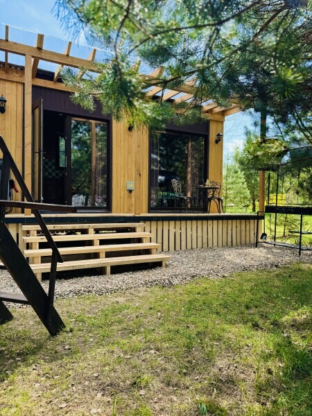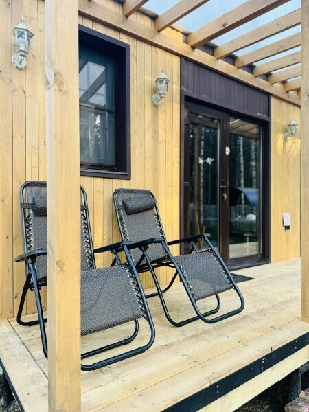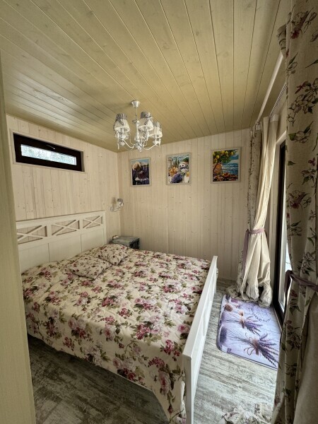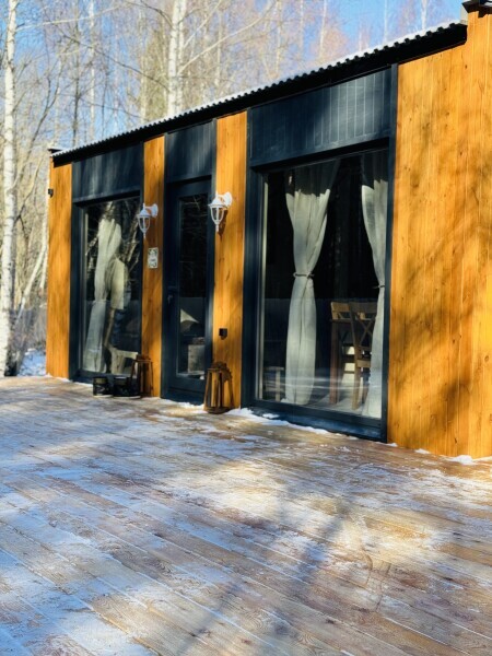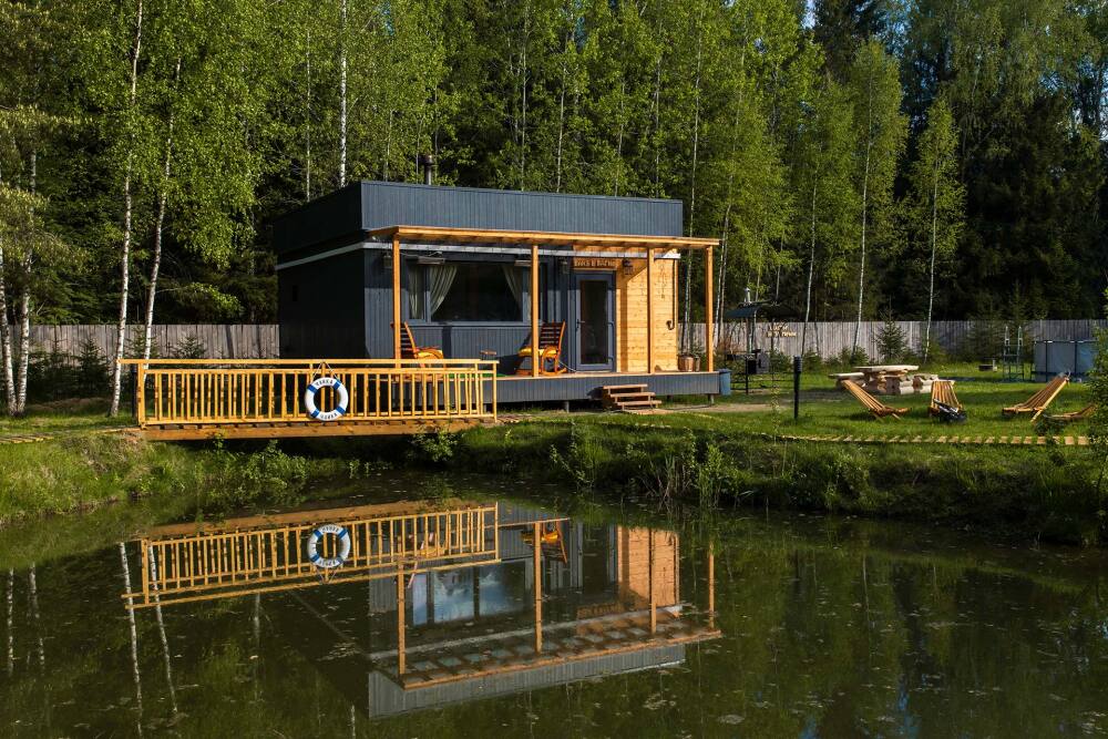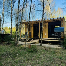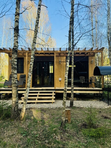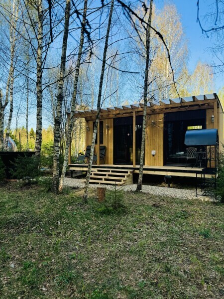 В доме: кухня с холодильником, плитой, чайником, кофемашиной и микроволновой печью. Зонированная спальня с двуспальной кроватью и панорамным окном с видом на лес, а также ванная комната с просторной душевой.