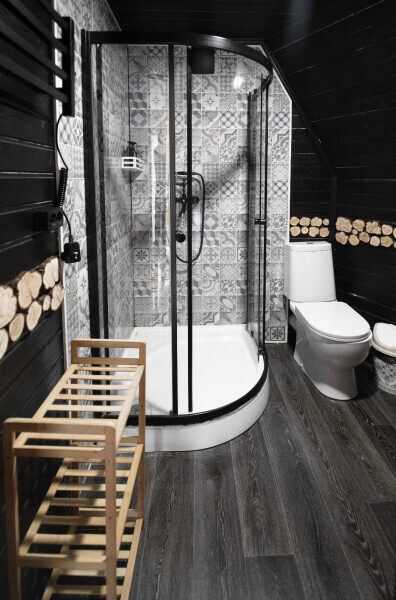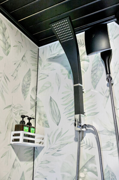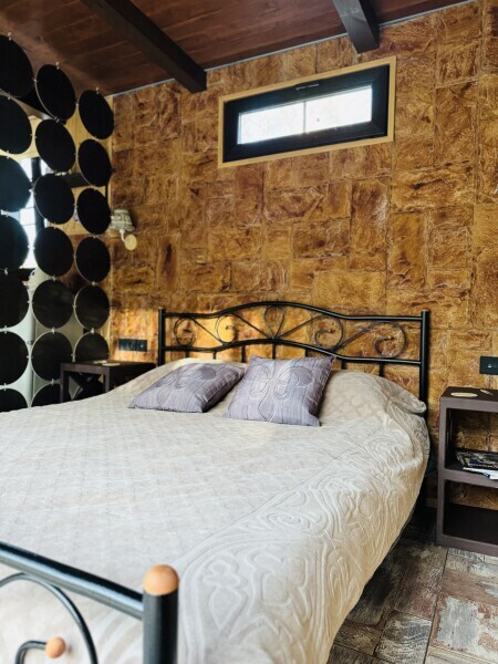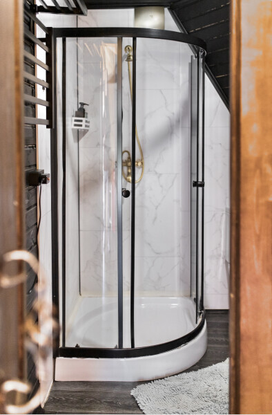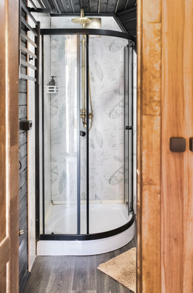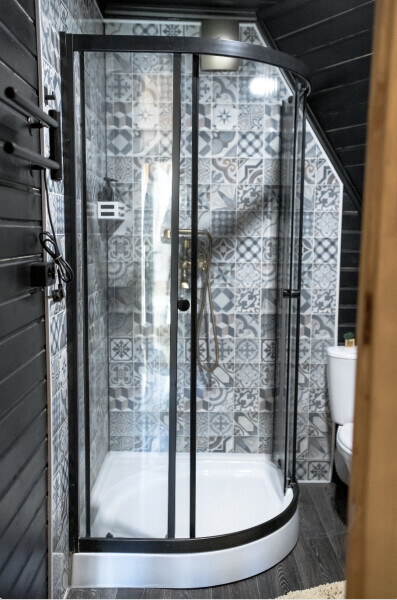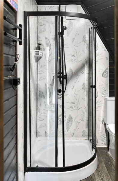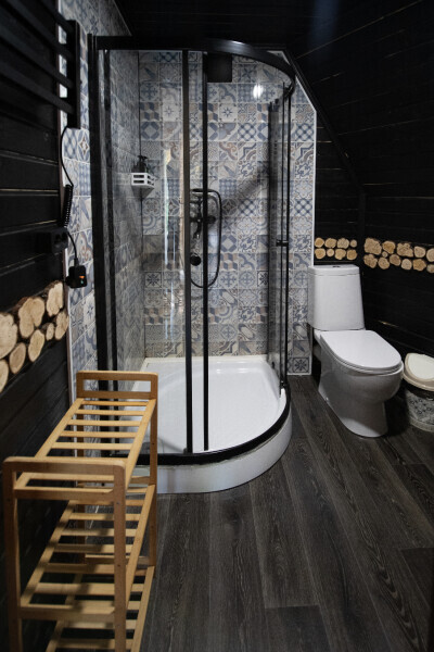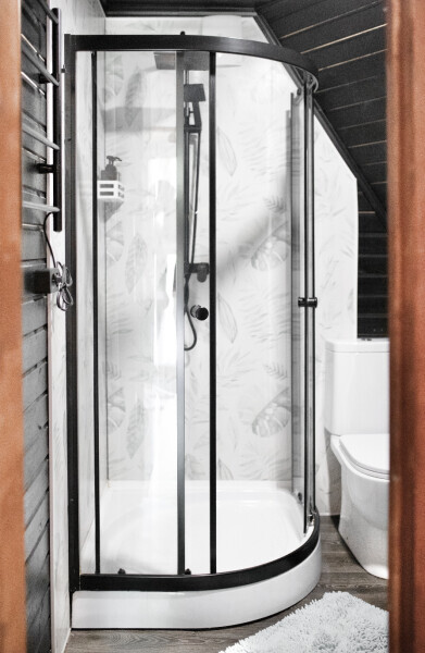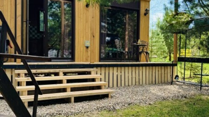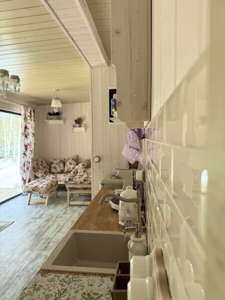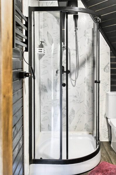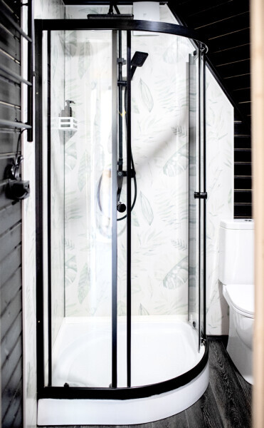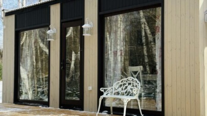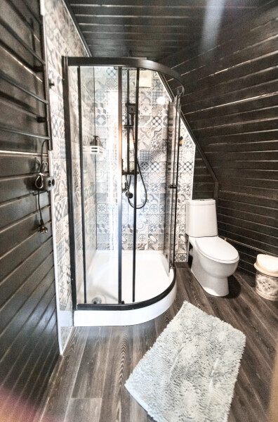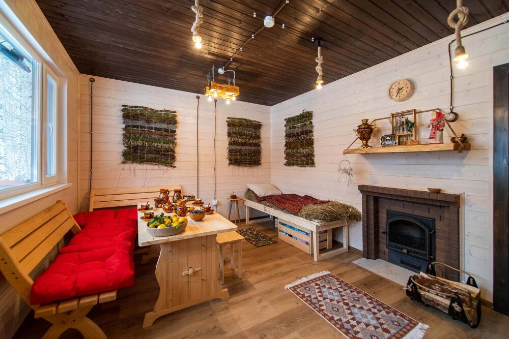 В доме: кухня с холодильником, плитой, чайником, кофемашиной и микроволновой печью. Зонированная спальня с двуспальной кроватью и панорамным окном с видом на лес, а также ванная комната с просторной душевой.