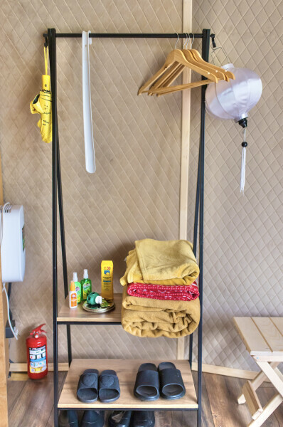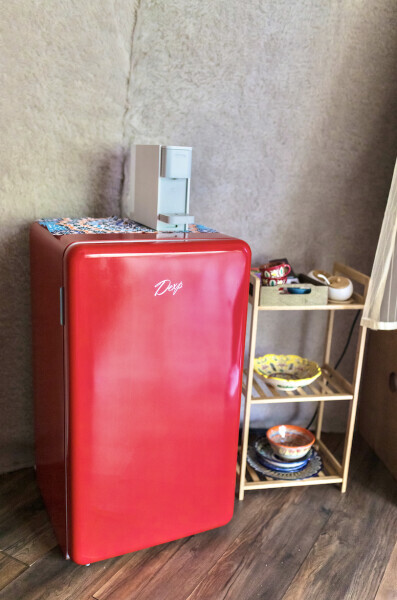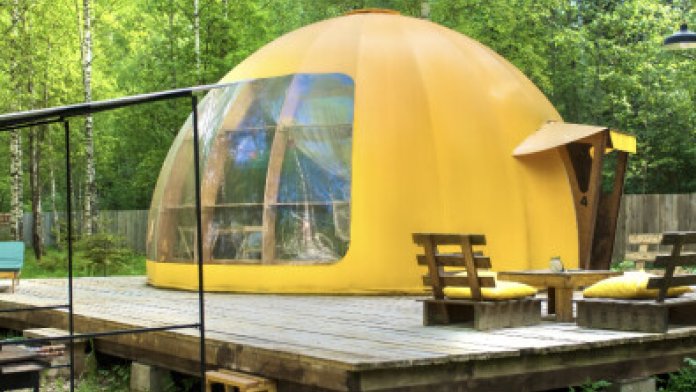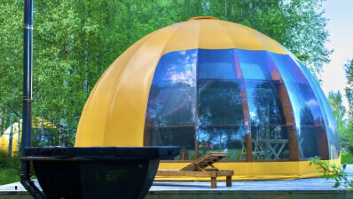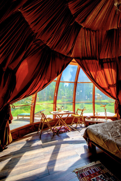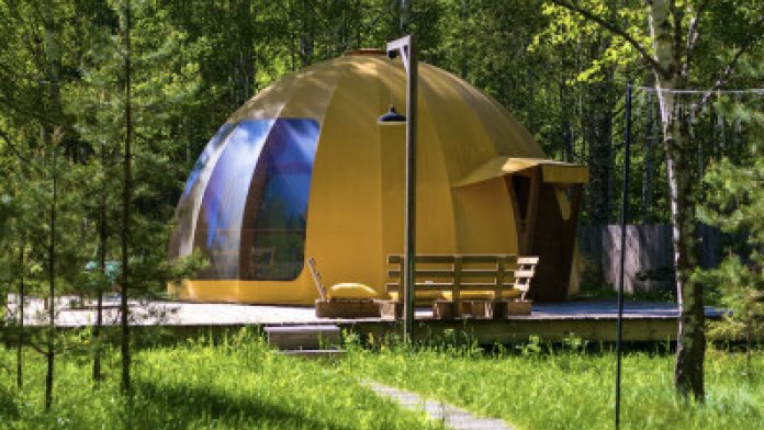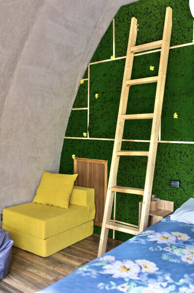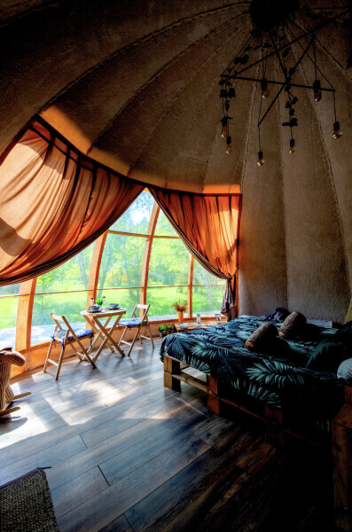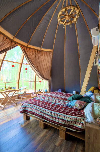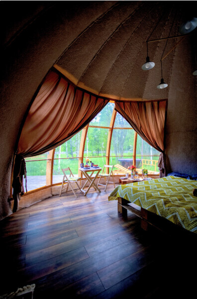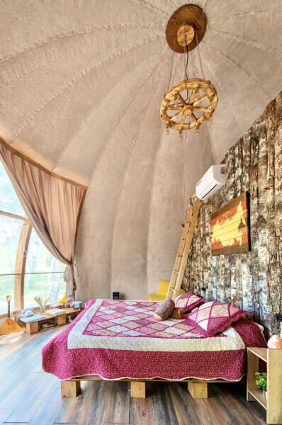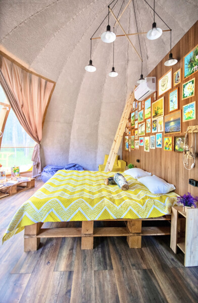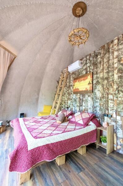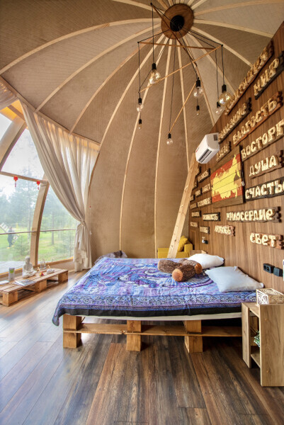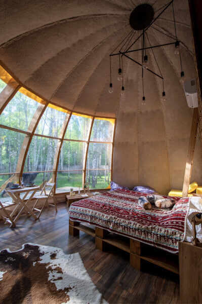 Глэмпинг оборудован купольными домиками-сферами для комфортного проживания в любое время года. Каждая сфера отлична от остальных по дизайну и находится на комфортном расстоянии от других для уединенности гостей. Все домики включают в себя: одну двуспальную кровать, чистое постельное белье и розетку возле спального места. Присутствует собственная ванная комната с необходимыми средствами личной гигиены.