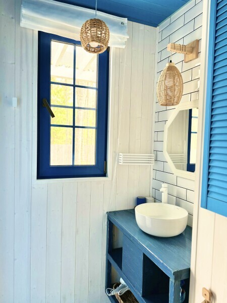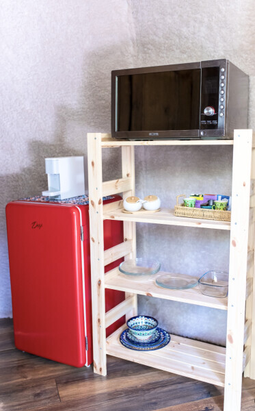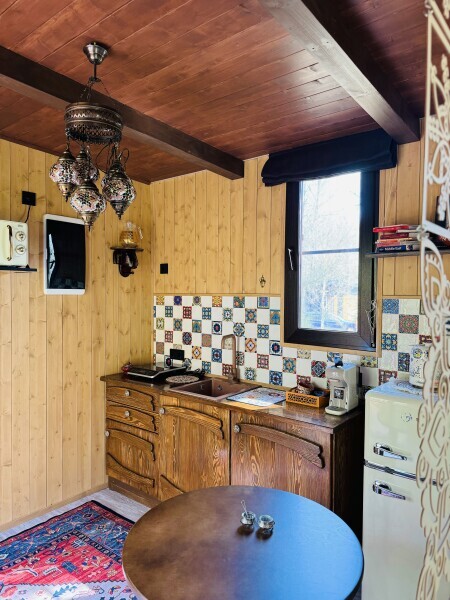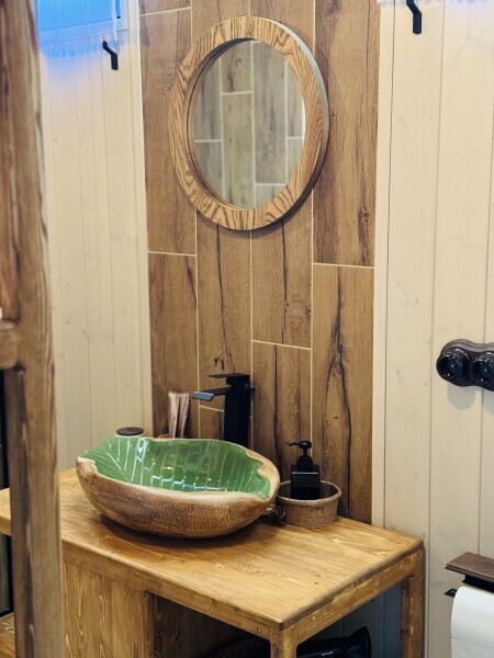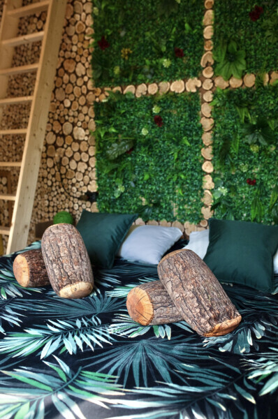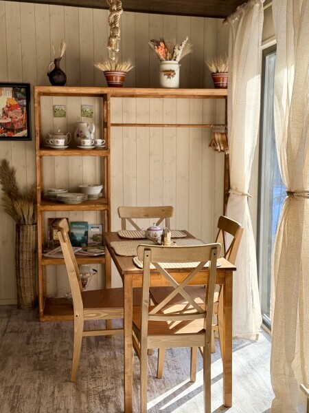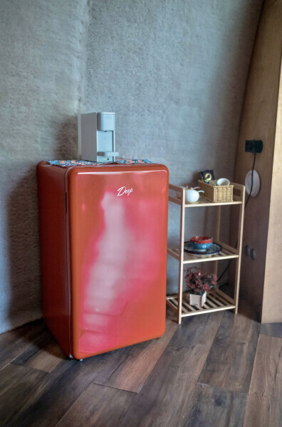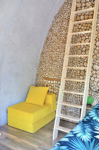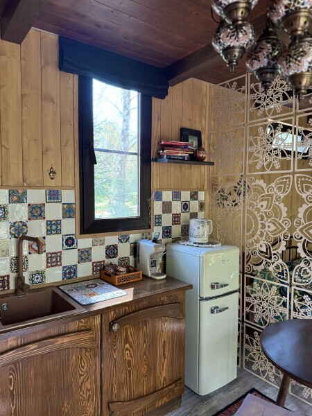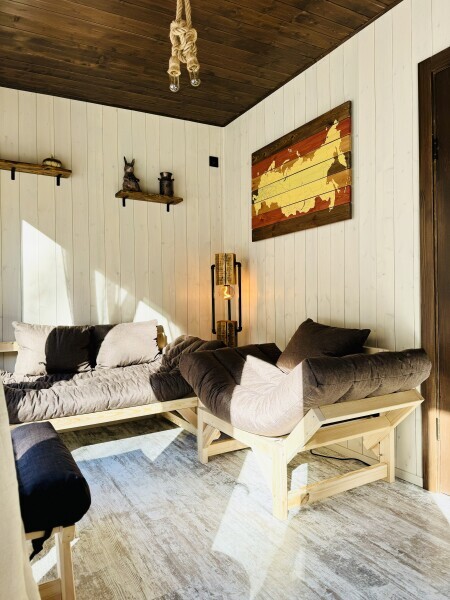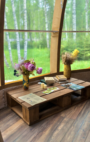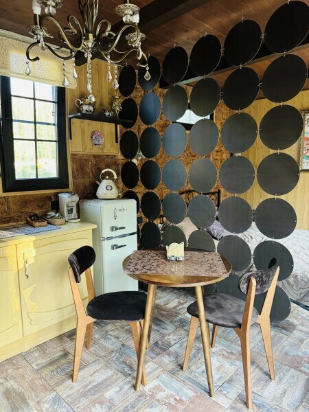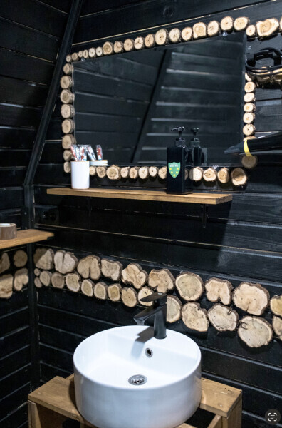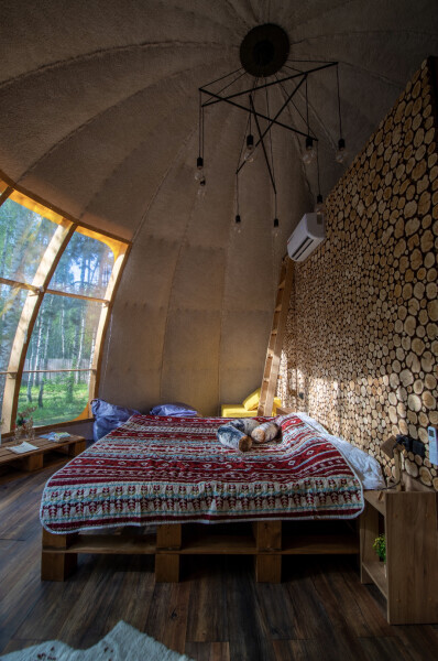 Футуристичная и до невозможности уютная сфера с можжевеловой стеной и предметами интерьера из можжевельника, обшитая мягким, плюшевым мехом в светлых тонах. Из панорамного окна сферы открывается роскошный вид на лес. В сфере есть всё для комфортного отдыха: кондиционер, санузел, душ, фен, кухня со всем необходимым оборудованием и посудой, кофемашина. В Вашем распоряжении огромная личная веранда с садовой мебелью, шезлонгом и мангальной зоной.