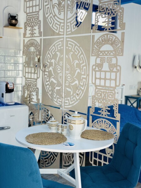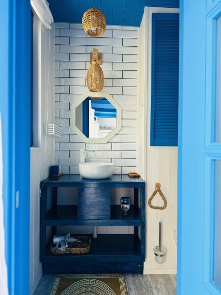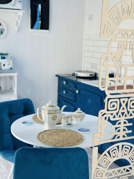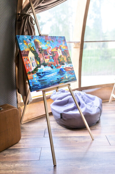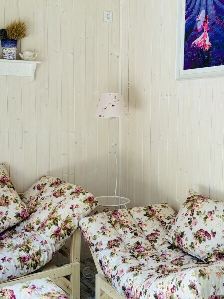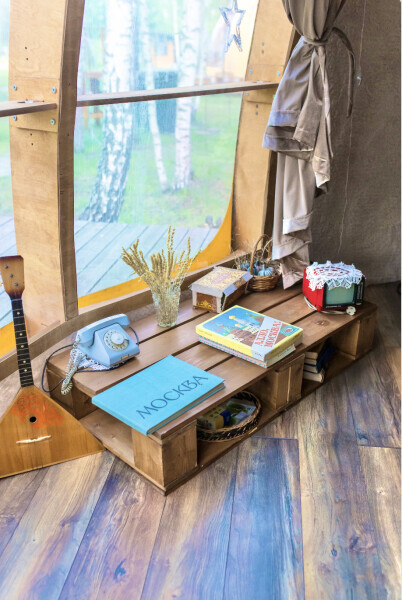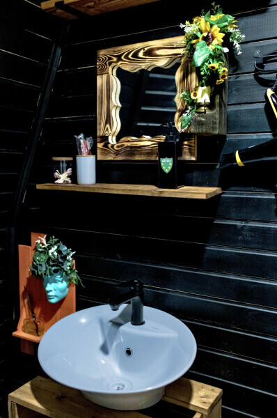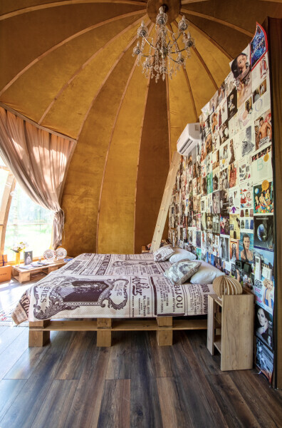 Интерьер сферы посвящен искусству: на стенах Вы найдете картины российских художников, а на журнальном столике книги о живописи. В сфере есть всё для комфортного отдыха: кондиционер, санузел, душ, фен, кухня со всем необходимым оборудованием и посудой, кофемашина. В Вашем распоряжении огромная личная веранда с садовой мебелью, шезлонгом и мангальной зоной. Именно на веранде расположен индивидуальный горячий банный чан.