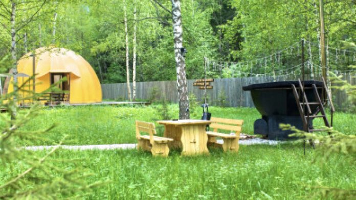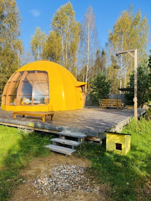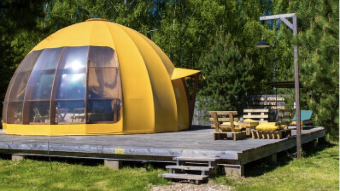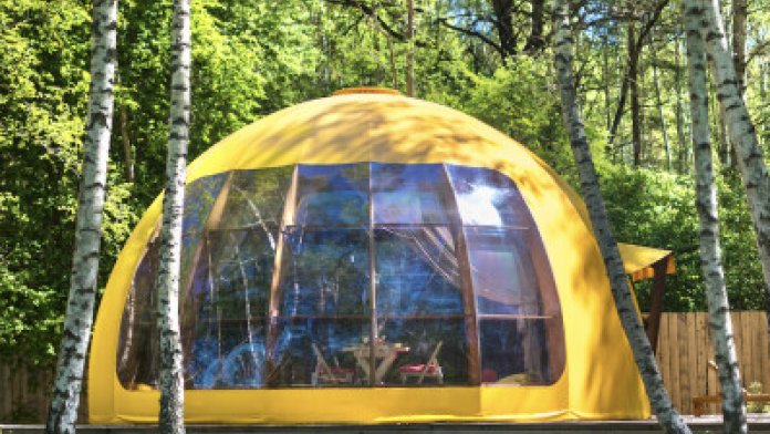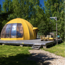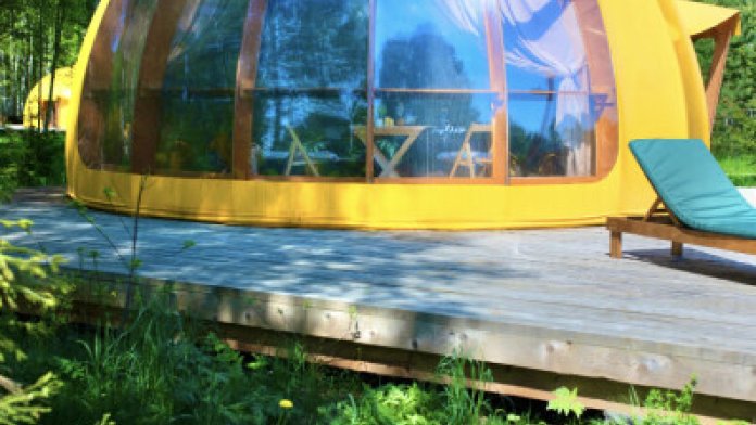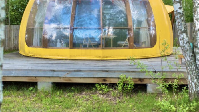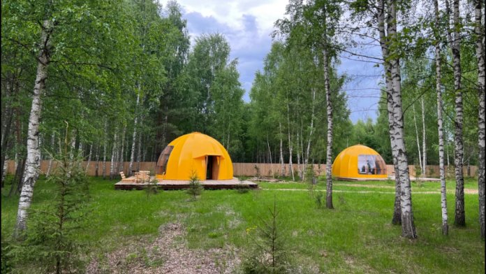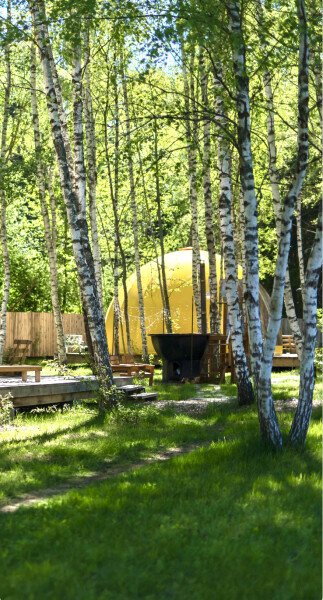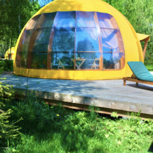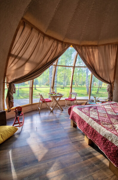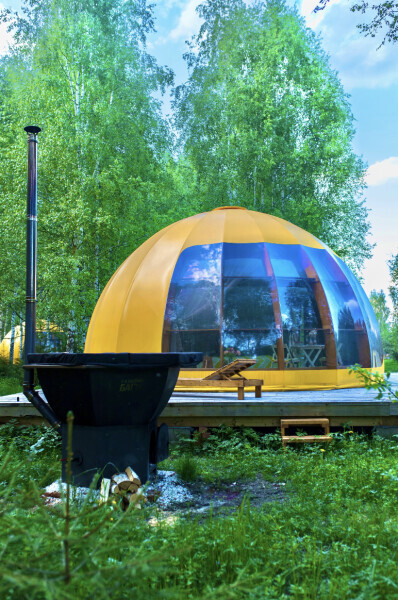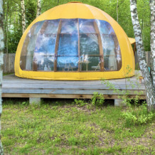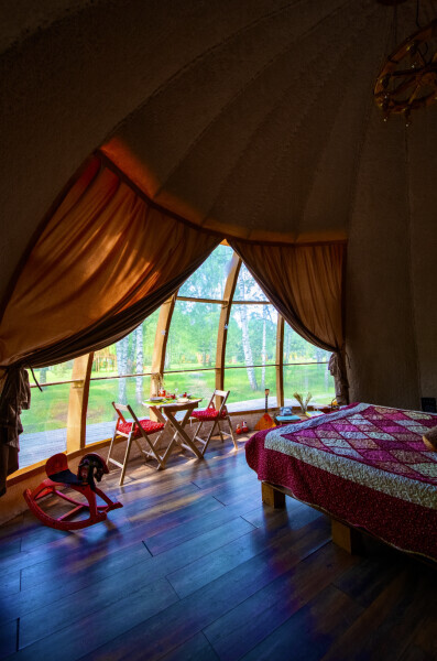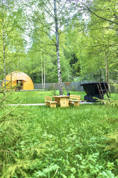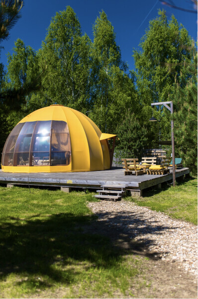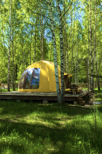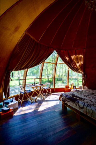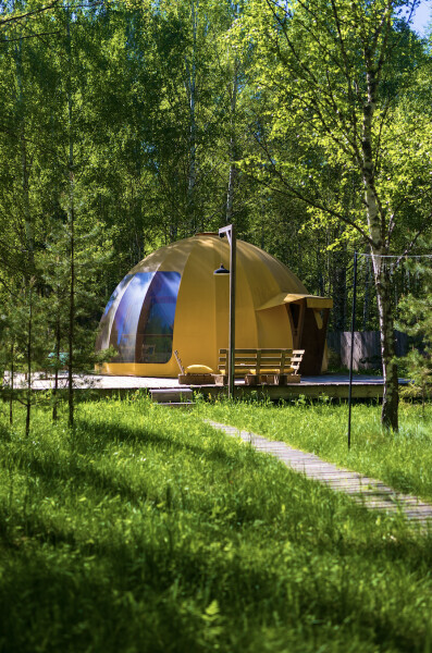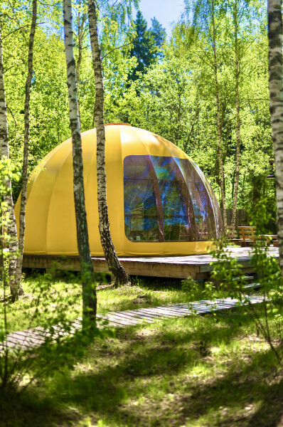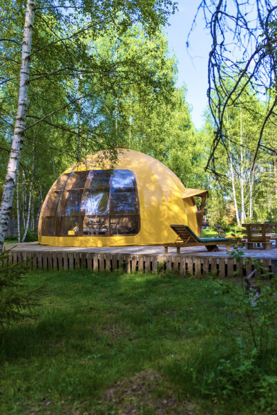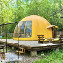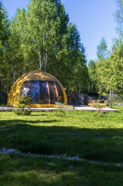 Продуманные, красивые и очень уютные дома-сферы, огромная территория с множеством развлечений, заповедный лес, река в пешей доступности (буквально 4 минуты пешком), тишина, и, конечно, множество достопримечательностей в окрестностях глэмпинга.