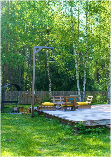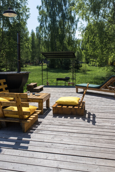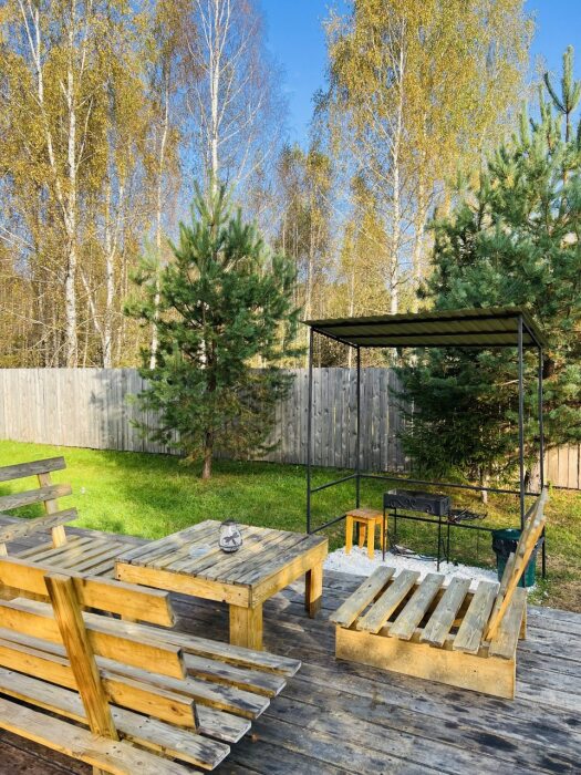 У дома есть огромная терраса с уличной мебелью, с собственной мангальной зоной и банным чаном.