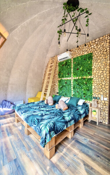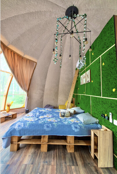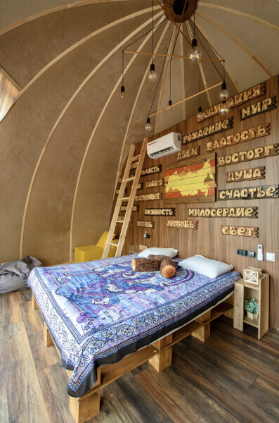 Футуристичная и до невозможности уютная сфера, обшитая мягким и плюшевым мехом в светлых тонах. В сфере много зелени, а также предметов интерьера из можжевельника. В сфере есть всё для комфортного отдыха: кондиционер, санузел, душ, фен, кухня со всем необходимым оборудованием и посудой, кофемашина. В Вашем распоряжении огромная личная веранда с садовой мебелью, шезлонгом и мангальной зоной. Именно на веранде расположен индивидуальный горячий банный чан.