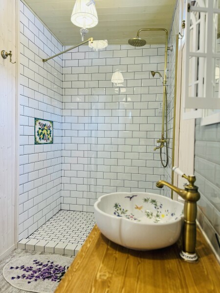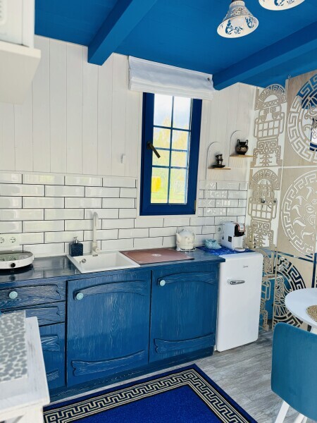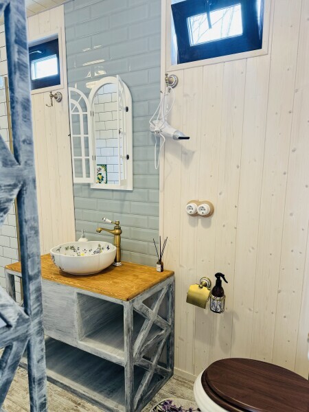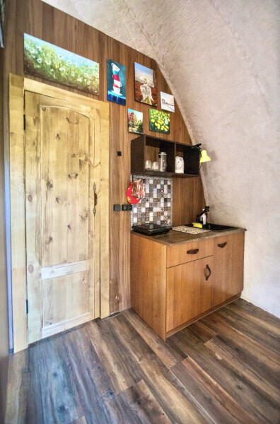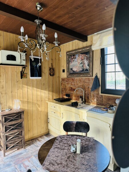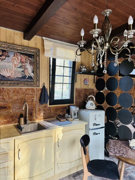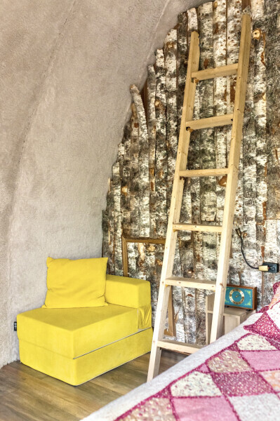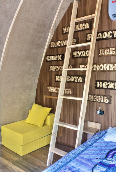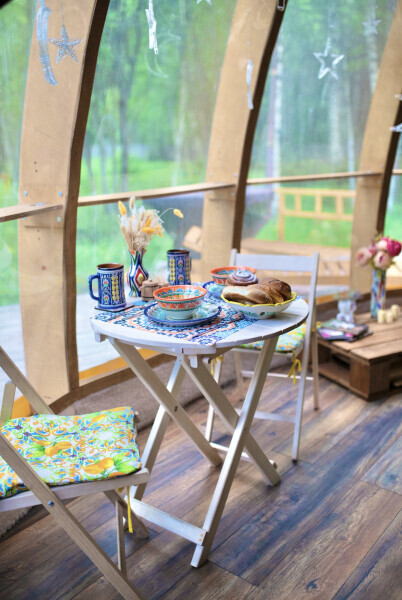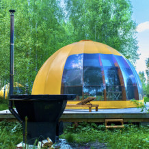 До невозможности уютная сфера, обшитая мягким и плюшевым мехом в светлых тонах, и стилизованная под бабушкин домик. В сфере есть всё для комфортного отдыха: кондиционер, санузел, душ, фен, кухня со всем необходимым оборудованием и посудой, кофемашина. В Вашем распоряжении огромная личная веранда с садовой мебелью, шезлонгом и мангальной зоной. Также в этой сфере есть возможность арендовать горячий банный чан.