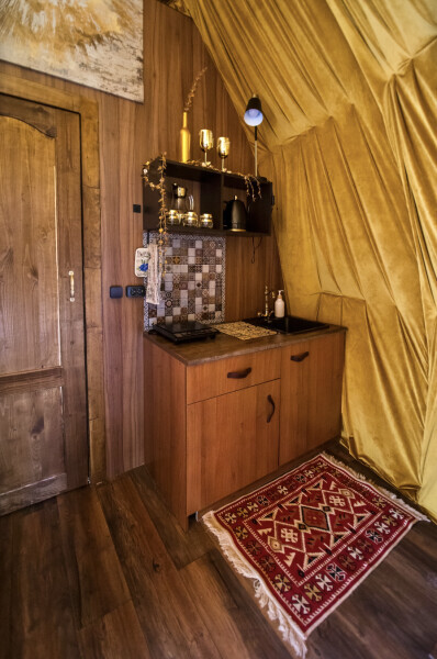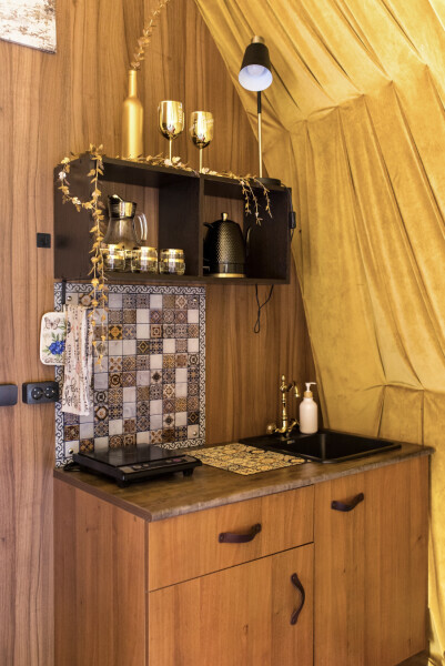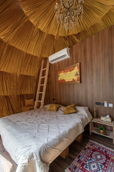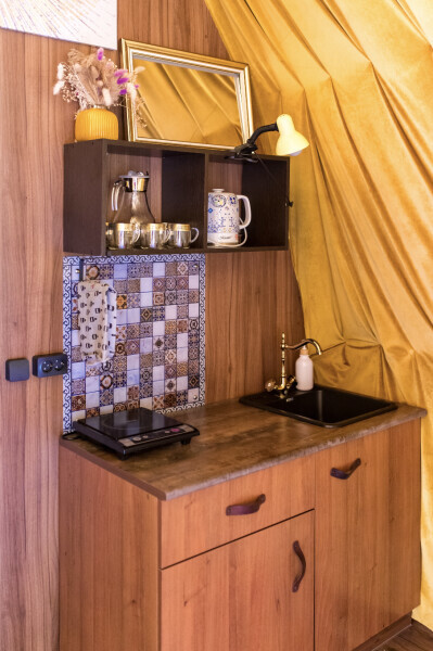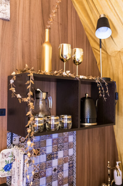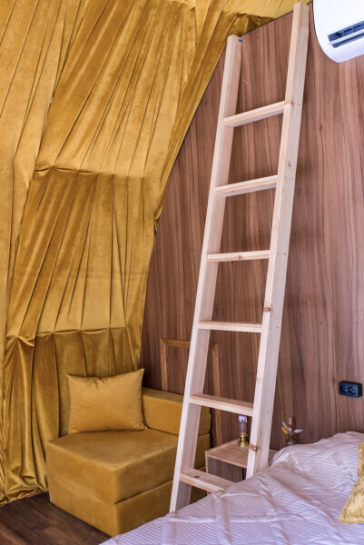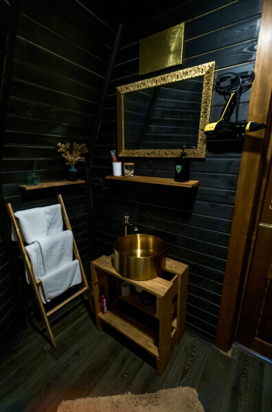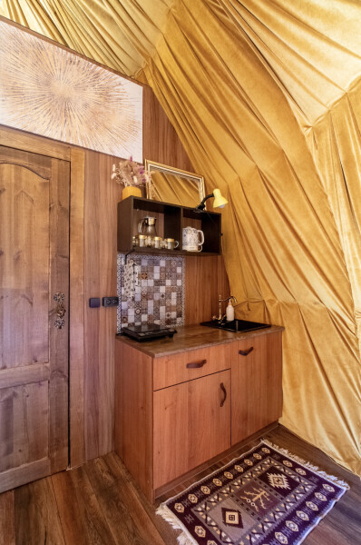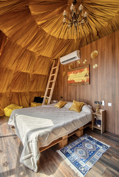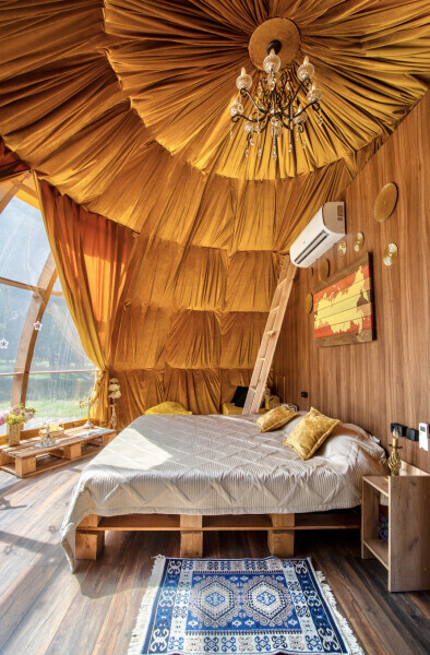 Футуристичная и просторная сфера, интерьер которой выполнен в классическом стиле: роскошный бархат, хрустальная люстра, массивные шторы и много золота. В сфере есть всё для комфортного отдыха: кондиционер, санузел, душ, фен, кухня со всем необходимым оборудованием и посудой, кофемашина. В Вашем распоряжении огромная личная веранда с садовой мебелью, шезлонгом и мангальной зоной. Также в этой сфере есть возможность арендовать горячий банный чан.