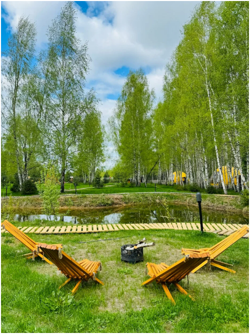 На территории также расположена русская баня на дровах, несколько спортивных площадок, уютных зон отдыха, пруд и два небольших бассейна.