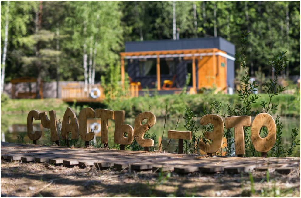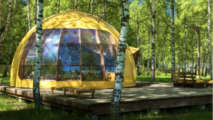Глэмпинг «Багио» расположен в деревне Харланиха-2, Московской области, недалеко от «Усадьбы Стебелево».