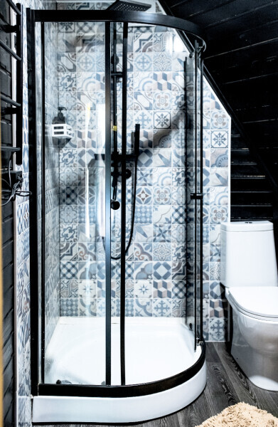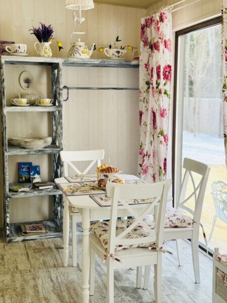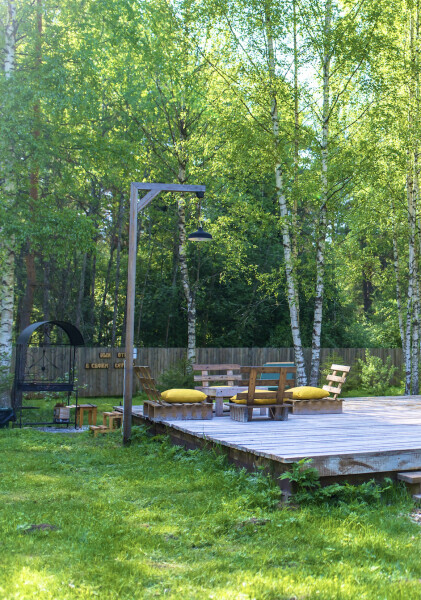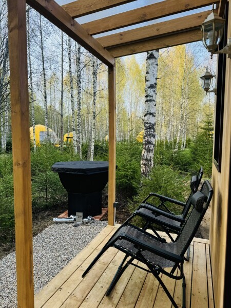 Дом отвернут от территории глэмпинга, поэтому из огромных панорамных окон открывается вид на заповедный лес. И ещё один бонус — личный сад окруженный хвойными деревьями!