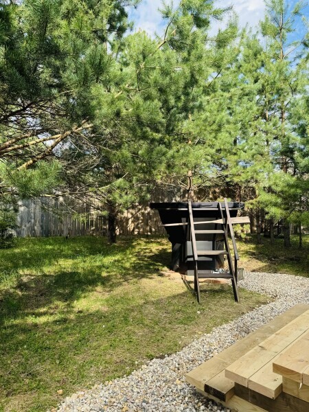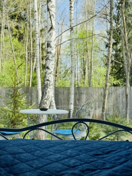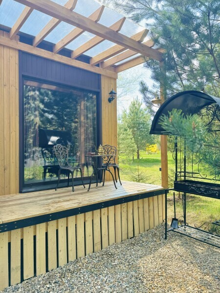 Дом отвернут от территории глэмпинга, поэтому из огромных панорамных окон открывается вид на заповедный лес. И ещё один бонус - личный сад окруженный хвойными деревьями!